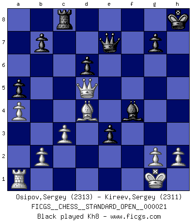 Last move : 1/2-1/2 2025 May 21 20:47:15 [Event "FICGS__CHESS__STANDARD_OPEN__000021"] [Site "FICGS"] [Date "2025.05.08"] [Round "2"] [White "Osipov,Sergey"] [Black "Kireev,Sergey"] [Result "1/2-1/2"] [WhiteElo "2313"] [BlackElo "2311"] 1.e4 c5 2.Nf3 d6 3.d4 cxd4 4.Nxd4 Nf6 5.Nc3 a6 6.Be3 e5 7.Nb3 Be7 8.f3 Be6 9.Qd2 h5 10.Nd5 Nxd5 11.exd5 Bf5 12.Be2 a5 13.a4 Nd7 14.O-O O-O 15.f4 exf4 16.Bxf4 Rc8 17.c3 Nf6 18.Be3 Be4 19.Bd4 Nxd5 20.Bxh5 Bg5 21.Qe2 f5 22.Nd2 Nf4 23.Rxf4 Bxf4 24.Nxe4 fxe4 25.Bg4 Qe7 26.Bxc8 Rxc8 27.Qb5 e3 28.Qd5+ Kh8 29.Qh5+ 1/2-1/2 Follow this game move after move (download)Chess is like war on a board. (Bobby Fischer) Das Blackmar-Diemer-Gambit verändert den ganzen Menschen! (Emil Joseph Diemer) Yo considero que Fischer es uno de los expertos mas grandes de aperturas de siempre. (Keith Hayward) Demandez au pauvre Cg1 ce qu'il en pense. Eduard Gufeld à propos de la variante Saemisch de l'Est-Indienne. I couldn't make any sense out of what this particular thread is about. It sounds like R2 D2 computer speaking. A space fight ?!? Some 'command' problems in Moscow ? Some killers & narcotic addicts attacking some game & a god wannabe ?? (Dinesh De Silva, lost in a russian conflict in FICGS forum)