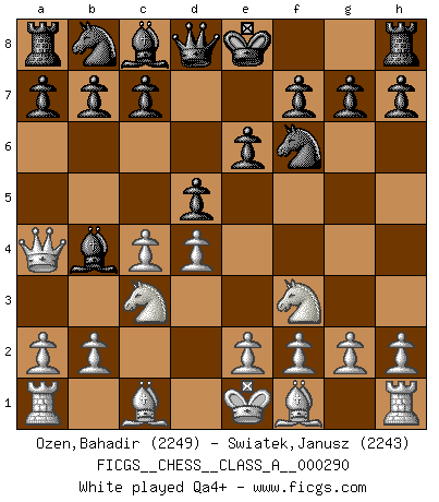 Last move : 1/2-1/2 2025 July 24 19:27:40 [Event "FICGS__CHESS__CLASS_A__000290"] [Site "FICGS"] [Date "2025.05.09"] [Round "1"] [White "Ozen,Bahadir"] [Black "Swiatek,Janusz"] [Result "1/2-1/2"] [WhiteElo "2249"] [BlackElo "2243"] 1.d4 Nf6 2.c4 e6 3.Nf3 d5 4.Nc3 Bb4 5.Qa4+ Nc6 6.e3 O-O 7.Bd2 dxc4 8.Bxc4 Bd6 9.Qc2 e5 10.dxe5 Nxe5 11.Nxe5 Bxe5 12.f4 Bxc3 13.Bxc3 Ng4 14.Bd4 c5 15.Bxc5 Re8 16.O-O Nxe3 17.Bxe3 Rxe3 18.Qf2 Re4 19.Rad1 Qf6 20.Bd5 1/2-1/2 Follow this game move after move (download)The essence of Chess is thinking about what Chess is. (David Bronstein) Besser ein falscher Plan, logisch durchgeführt, als gar kein Plan. (Viktor Kortschnoi) El arma más poderosa en el Ajedrez, es tener la próxima movida. (David Bronstein) Avant la finale, les dieux ont créé le milieu de partie. (Tarrasch) I find television to be very educating. Every time somebody turns on the set, I go in the other room and read a book. (Groucho Marx)
