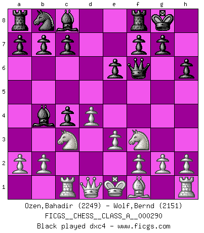 Last move : 1/2-1/2 2025 July 4 17:35:19 [Event "FICGS__CHESS__CLASS_A__000290"] [Site "FICGS"] [Date "2025.05.09"] [Round "1"] [White "Ozen,Bahadir"] [Black "Wolf,Bernd"] [Result "1/2-1/2"] [WhiteElo "2249"] [BlackElo "2151"] 1.d4 Nf6 2.c4 e6 3.Nf3 d5 4.Nc3 Bb4 5.Bg5 h6 6.Bxf6 Qxf6 7.e3 O-O 8.Rc1 dxc4 9.Bxc4 c5 10.O-O cxd4 11.Nxd4 Bd7 12.Ne4 Qe5 13.Be2 Rd8 14.Qc2 Nc6 15.Nf3 Qa5 16.a3 Bf8 17.Nc5 Bxc5 18.Qxc5 Rac8 19.Rfd1 Qxc5 20.Rxc5 1/2-1/2 Follow this game move after move (download)There is only one thing Fischer does in Chess without pleasure: to lose ! (Boris Spassky) Der Partner hat auch seine Existenzberechtigung. (Savielly Grigorievitsch Tartakower) Los finales de Peón son del Ajedrez lo que el cesped es del Golf. (Cecil Purdy) Celui qui prend des risques peut perdre, celui qui n'en prend pas perd toujours. (Xavier Tartacover) You must have a dream in order to have it come true. (A.P.J. Kalam)