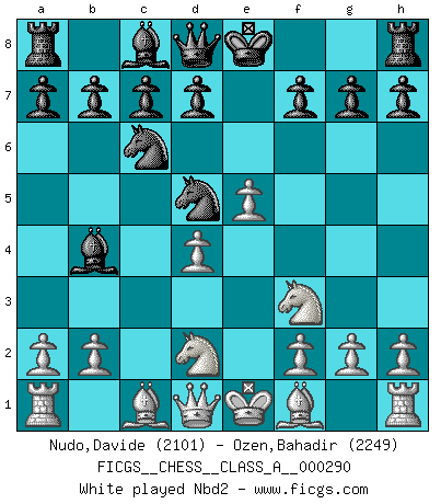 Last move : 1/2-1/2 2025 July 5 19:21:58 [Event "FICGS__CHESS__CLASS_A__000290"] [Site "FICGS"] [Date "2025.05.09"] [Round "1"] [White "Nudo,Davide"] [Black "Ozen,Bahadir"] [Result "1/2-1/2"] [WhiteElo "2101"] [BlackElo "2249"] 1.e4 e5 2.Nf3 Nc6 3.c3 Nf6 4.d4 exd4 5.e5 Nd5 6.cxd4 Bb4+ 7.Nbd2 d6 8.a3 Bxd2+ 9.Bxd2 O-O 10.Bb5 Bg4 11.h3 Bxf3 12.Qxf3 dxe5 13.Bxc6 bxc6 14.dxe5 Qe7 15.Qe4 Rae8 16.O-O Qxe5 17.Qc2 Qf6 18.Rae1 h6 19.Bc1 1/2-1/2 Follow this game move after move (download)Chess is not like life... it has rules ! (Mark Pasternak) Ein typischer, sehr verbreiteter Gedankenschädling ist der, daß der betreffende Amateur von der Annanhme ausgeht, daß jeder einzelne Zug etwas zu leisten habe. (Aaron Nimzowitsch) El ganador de una partida es aquel jugador que hace el penúltimo error. (Savielly Tartakover) L'ordinateur a tué l'originalité. Il n'y a plus guère d'aventures sur l'échiquier. (Jacob Murray) Nothing is more important for teaching us to understand the concepts we have than constructing fictitious ones. (Ludwig Wittgenstein)