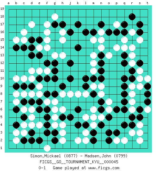 Last move : 0-1 2008 January 17 21:1:4 [Event "FICGS__GO__TOURNAMENT_KYU__000045"] [Site "FICGS"] [Date "2007.09.30"] [Round "1"] [Black "Simon,Mickael"] [White "Madsen,John"] [Result "0-1"] [Rating 1 "0877"] [Rating 2 "0799"] 1.q16 d4 2.q4 d17 3.d15 c15 4.c14 c16 5.d13 f17 6.c9 c6 7.q10 r14 8.n17 p14 9.s16 r6 10.o3 r3 11.r4 s4 12.s5 s3 13.r5 p2 14.p3 q2 15.o2 s2 16.f3 h3 17.f5 l3 18.h5 g4 19.f4 g5 20.f6 h6 21.j5 g6 22.k6 d8 23.e10 f7 24.d2 c3 25.c2 b2 26.g2 h2 27.e7 e8 28.f8 g7 29.b4 b3 30.b6 b7 31.c5 d5 32.c7 d6 33.d7 c8 34.e6 b8 35.g3 h4 36.d3 c4 37.g8 h8 38.g10 d10 39.d9 c10 40.b9 e9 41.f10 b10 42.h9 j8 43.j10 l8 44.q13 q14 45.q6 m6 46.l4 m4 47.m3 l5 48.k4 l2 49.n4 m5 50.m2 k2 51.k17 r13 52.q12 s11 53.l10 n14 54.k14 r9 55.q9 r8 56.q8 r7 57.q7 e14 58.e15 f15 59.e13 f14 60.d14 g13 61.h17 p17 62.p16 r17 63.q17 r16 64.r15 s15 65.s17 q15 66.r18 h16 67.j16 h15 68.r15 r16 69.b14 b15 70.g17 f16 71.s12 r12 72.r10 s10 73.r11 n16 74.o16 n15 75.m16 n9 76.m8 m9 77.l9 k8 78.n7 o7 79.n6 n5 80.o5 o6 81.p6 n8 82.n11 e11 83.f12 f11 84.g11 d11 85.g12 h13 86.j12 m15 87.l16 m11 88.m10 m12 89.n12 m13 90.n13 o13 91.n10 g18 92.t9 s9 93.t8 t6 94.s6 t10 95.t7 e4 96.e2 f1 0-1 Here are the names of the openings (joseki) played in the four corners : Corner d16 : d17 d15 Komoku (Somok, Xiao~mu`) 3-4 Point. The komoku (3-4) point is the traditional corner enclosure move.. Ikken Takagakari (Hankan Nop'dakeolch'im, Yi Gaogua`jiao~, 1-Space High Approach). The 5-4 approach move has become more popular in modern times, as modern Go emphasizes speed and influence. Corner d4 : d4 c9 Hoshi (Hwajeom, Seongjeom, Xingwei`) 4-4 Point. The star or hoshi (4-4) point, emphasizing influence at the potential expense of territory. Corner q16 : q16 r14 Hoshi (Hwajeom, Seongjeom, Xingwei`) 4-4 Point. The star or hoshi (4-4) point, emphasizing influence at the potential expense of territory. Ikken Kakari (Hankan Keolch'im, Yi Gua`jiao~, 1-Space Low Approach). White 2 is the standard approach move to the 4-4. Corner q4 : q4 r6 Hoshi (Hwajeom, Seongjeom, Xingwei`) 4-4 Point. The star or hoshi (4-4) point, emphasizing influence at the potential expense of territory. Ikken Kakari (Hankan Keolch'im, Yi Gua`jiao~, 1-Space Low Approach). White 2 is the standard approach move to the 4-4. Player White won this Go (weiqi, baduk) game. Follow this game move after move (download)Beware of the clumsy double contact. (Anonymous) When the going gets tactical, the computers get going. (Hyatt)