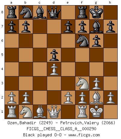 Last move : 1/2-1/2 2025 September 18 19:58:32 [Event "FICGS__CHESS__CLASS_A__000290"] [Site "FICGS"] [Date "2025.05.09"] [Round "1"] [White "Ozen,Bahadir"] [Black "Petrovich,Valery"] [Result "1/2-1/2"] [WhiteElo "2249"] [BlackElo "2066"] 1.d4 Nf6 2.c4 g6 3.g3 c6 4.Bg2 d5 5.cxd5 cxd5 6.Nf3 Bg7 7.O-O O-O 8.Nc3 Ne4 9.Nd2 Nxd2 10.Bxd2 e6 11.e3 Nc6 12.Re1 Bd7 13.h4 h5 14.Rc1 Rc8 15.Ne2 a5 16.Nf4 b6 17.b3 Qe7 18.Bc3 Na7 19.a4 Rc7 20.Qd2 Qd6 21.b4 Bxa4 22.bxa5 bxa5 23.Bxa5 Rxc1 24.Rxc1 Nc6 25.Bb6 Rb8 26.Ra1 Rxb6 27.Rxa4 Qb8 28.Qd3 Rb1+ 29.Kh2 Ne7 30.Qa3 Bf8 31.Ra8 Qc7 32.Qa4 Nf5 33.Qe8 Qe7 34.Qxe7 Nxe7 35.Bh3 Rb2 36.Kg2 Rb6 37.Kg1 Kg7 38.Ra7 Kf6 39.Ra8 Bh6 40.Nd3 Nc6 41.Nc5 Rb1+ 42.Kg2 Rb2 43.Kg1 Ke7 44.Ra6 Rb1+ 45.Kg2 Kd6 46.Nd3 Bg7 47.g4 Rb3 48.Nc1 Rc3 49.Ne2 Rb3 50.Nc1 Rb1 51.Nd3 1/2-1/2 Follow this game move after move (download)Becoming successful at Chess allows you to discover your own personality. That's what I want for the kids I teach. (Saudin Robovic) Die größte Kunst beim Schach besteht darin dem Gegner nicht zu zeigen was er tun kann. (Garry Kasparov) Sin errores no puede haber brillantez. (Emanuel Lasker) Dans le domaine de la peinture, de la gravure et de la sculpture, dès la première décennie de notre siècle, les artistes abandonnent la représentation de la partie d'échecs pour se concentrer sur les pièces, sur les échiquiers et sur toutes les variations auxquelles les unes et les autres peuvent donner lieu. On passe en quelque sorte d'un thème social à un thème musical (au sens de la musica médiévale, c'est-à-dire d'une notion qui inclue le rythme, l'harmonie, la construction et la déconstruction, etc.). Graphiquement et picturalement, l'échiquier apparaît comme une structure ouverte, dynamique, d'une richesse infinie, autorisant toutes les combinatoires et débouchant sur des mouvements et des rythmes de nature exponentielle. (Michel Pastoureau) Establishing goals is all right if you don't let them deprive you of interesting detours. (Doug Larson)