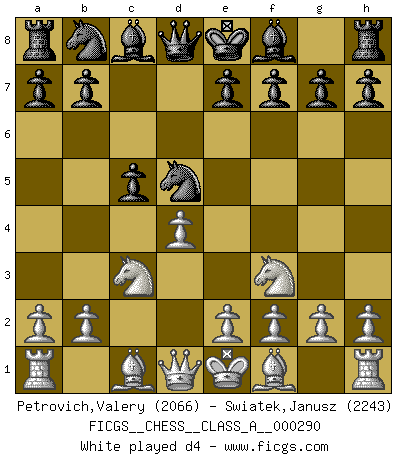 Last move : 1/2-1/2 2025 September 17 11:52:4 [Event "FICGS__CHESS__CLASS_A__000290"] [Site "FICGS"] [Date "2025.05.09"] [Round "1"] [White "Petrovich,Valery"] [Black "Swiatek,Janusz"] [Result "1/2-1/2"] [WhiteElo "2066"] [BlackElo "2243"] 1.Nf3 Nf6 2.c4 c5 3.Nc3 d5 4.cxd5 Nxd5 5.d4 Nxc3 6.bxc3 g6 7.e4 Bg7 8.Rb1 O-O 9.Be2 cxd4 10.cxd4 Qa5+ 11.Bd2 Qxa2 12.O-O Bg4 13.Be3 Nc6 14.d5 Ne5 15.Rxb7 a5 16.Rxe7 a4 17.Re1 Qa3 18.Rb7 Qc3 19.Nxe5 Bxe2 20.Bd4 Bxd1 21.Bxc3 Rfc8 22.Bd4 Bc2 23.f3 a3 24.Ba1 Rcb8 25.Rc7 Ba4 26.Nxf7 a2 27.Bxg7 Kxg7 28.Ne5 Kf8 29.R7c1 Ke8 30.Nc4 Bb5 31.Ne5 Ba4 32.Nd3 Bb5 33.Nb4 Bd7 34.Nxa2 Rxa2 35.Ra1 Rd2 36.Rad1 Rxd1 37.Rxd1 g5 38.e5 Ke7 39.Rd2 h5 40.Kf2 Ra8 41.Rb2 Ra5 42.Rd2 Ra3 43.Rc2 Ra5 44.e6 Be8 45.Rc7+ Kd6 46.Rc8 Ba4 1/2-1/2 Follow this game move after move (download)Though most people love to look at the games of the great attacking masters, some of the most successful players in history have been the quiet positional players. They slowly grind you down by taking away your space, tying up your pieces, and leaving you with virtually nothing to do ! (Yasser Seirawan) Frage des Reporters: -Worin besteht das Ziel von Gambiteröffnungen? Antwort: -Auf Kosten der Partie einen Ruf als Angriffspieler zu erwerben.- (Siegbert Tarrasch) Prefiero perder una partida realmente buena, que ganar una mala. (David Levy) Vous savez, camarade Pachman, je n'éprouve pas de plaisir à être ministre, je jouerais plutôt aux échecs comme vous, ou alors ferais une révolution au Venezuela. (Che Guevara à Ludek Pachman, 'Checkmate in Prague', 1975) I find your interest interesting. (Gregory House, House M.D.)