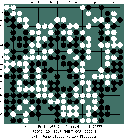 Last move : 0-1 2008 May 5 19:27:46 [Event "FICGS__GO__TOURNAMENT_KYU__000045"] [Site "FICGS"] [Date "2007.09.30"] [Round "1"] [Black "Hensen,Erik"] [White "Simon,Mickael"] [Result "0-1"] [Rating 1 "0564"] [Rating 2 "0877"] 1.q16 d4 2.q4 d16 3.c14 f16 4.f3 d6 5.j3 e3 6.f4 l3 7.b16 c17 8.c11 k17 9.c8 o3 10.r6 q2 11.r3 o16 12.q14 q17 13.r17 p17 14.r18 r10 15.e7 r13 16.b6 s15 17.s16 r15 18.q15 r16 19.t17 o14 20.r2 r8 21.f14 h15 22.g15 g16 23.h14 j14 24.h13 j13 25.h11 h12 26.j12 g12 27.k11 f13 28.j15 h16 29.k14 g14 30.k13 f15 31.o19 o18 32.e14 e13 33.g13 d14 34.d13 e15 35.b17 b18 36.l5 k4 37.d12 g11 38.f12 h10 39.n12 q13 40.j11 g7 41.r14 s14 42.g10 d8 43.s12 s13 44.e8 d9 45.d7 c7 46.b8 c6 47.b7 f11 48.e2 d2 49.j7 e12 50.f2 o5 51.e5 e6 52.f6 f7 53.e9 d10 54.q19 n19 55.d5 d11 56.c4 c15 57.b14 g6 58.g9 f5 59.c5 f6 60.f10 h8 61.h9 j10 62.k10 j9 63.j8 k9 64.l9 k8 65.l8 j4 66.a18 b19 67.b15 c12 68.c13 c10 69.b11 b10 70.b12 c3 71.b3 b4 72.b5 b2 73.a4 a1 74.a2 a3 75.c1 b4 76.a5 d1 77.b3 k7 78.k6 b4 79.c16 d17 80.b3 l7 81.m7 b4 82.h6 h5 83.b3 s18 84.b4 s17 85.j2 l12 86.m13 n9 87.m4 m3 88.h3 m11 89.n14 o13 90.p2 p3 91.q3 o2 92.q1 o12 93.p6 n7 94.n6 o6 95.n11 o11 96.m10 m9 97.p7 m6 98.m8 n8 99.l10 n5 100.l6 p8 101.s7 s8 102.k16 l16 103.j16 j17 104.t8 t9 105.t7 r7 106.s6 l15 107.s9 t10 108.s10 s11 109.t11 r11 110.g4 g5 111.r9 q9 112.j5 h4 113.t12 l14 114.l13 p5 115.q7 q8 116.q5 o7 117.q6 n15 118.m1 n1 119.l1 m2 120.k1 k5 121.m14 j6 122.h7 m5 123.l4 k3 124.g8 n10 125.e4 n4 126.e10 e11 127.m15 m16 128.d15 p4 129.e14 r12 130.t10 a9 131.a8 t13 132.t9 n13 133.m12 k15 134.j14 k2 135.j5 o1 136.j6 p1 137.q2 l2 138.j1 f8 139.d14 f14 140.a2 a11 141.a3 a12 142.a13 a10 143.b9 c18 144.c9 a19 145.a17 f9 146.b1 pass 0-1 Here are the names of the openings (joseki) played in the four corners : Corner d16 : d16 c14 Hoshi (Hwajeom, Seongjeom, Xingwei`) 4-4 Point. The star or hoshi (4-4) point, emphasizing influence at the potential expense of territory. Ikken Kakari (Hankan Keolch'im, Yi Gua`jiao~, 1-Space Low Approach). Black 2 is the standard approach move to the 4-4. Corner d4 : d4 f3 Hoshi (Hwajeom, Seongjeom, Xingwei`) 4-4 Point. The star or hoshi (4-4) point, emphasizing influence at the potential expense of territory. Ikken Kakari (Hankan Keolch'im, Yi Gua`jiao~, 1-Space Low Approach). Black 2 is the standard approach move to the 4-4. Corner q4 : q4 l3 Hoshi (Hwajeom, Seongjeom, Xingwei`) 4-4 Point. The star or hoshi (4-4) point, emphasizing influence at the potential expense of territory. Corner q16 : q16 o16 Hoshi (Hwajeom, Seongjeom, Xingwei`) 4-4 Point. The star or hoshi (4-4) point, emphasizing influence at the potential expense of territory. Ikken Takagakari (Hankan Nop'dakeolch'im, Yi Gaojia, 1-Space High Approach). Black typically responds at 6-4 or 3-10. Black 4-10 is played when Black finds play on the right side advantageous. Black 4-8 or 3-8 may be played when Black has support at top. Player White won this Go (weiqi, baduk) game. Follow this game move after move (download)With only one group, you will win. (Anonymous) Perseverance does not equal worthiness. Next time you want to get my attention, wear something fun. Low-riding jeans are hot. (Gregory House, House M.D.)
