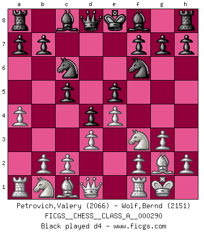 Last move : 1/2-1/2 2025 July 10 20:24:47 [Event "FICGS__CHESS__CLASS_A__000290"] [Site "FICGS"] [Date "2025.05.09"] [Round "1"] [White "Petrovich,Valery"] [Black "Wolf,Bernd"] [Result "1/2-1/2"] [WhiteElo "2066"] [BlackElo "2151"] 1.Nf3 d5 2.g3 Nf6 3.Bg2 c5 4.O-O e6 5.d3 Nc6 6.a4 e5 7.e4 d4 8.Na3 Bd6 9.Bd2 Bc7 10.Nb5 Bb8 11.Na3 Bc7 12.Ne1 h6 13.f4 exf4 14.gxf4 g5 15.f5 Bd7 16.c3 Qb8 17.Nc4 Bxh2+ 18.Kh1 Ne5 19.Nxe5 Bxe5 20.Nf3 Bf4 21.cxd4 cxd4 22.Bxf4 Qxf4 23.Nxd4 Qh4+ 24.Kg1 Ng4 25.Nf3 Qg3 26.Qe1 Qf4 27.Qd2 Qg3 28.Qe1 Qf4 29.Qd2 Qg3 30.Qe1 1/2-1/2 Follow this game move after move (download)I like to say that Bobby Fischer was the greatest player ever. But what made Fischer a genius was his ability to blend an American freshness and pragmatism with Russian ideas about strategy. (Bruce Pandolfini) Jeder leidlich begabte Spieler, er braucht keineswegs hervorragend veranlagt zu sein, kann es zum Meister bringen. Aber das ist ja auch gar nicht nötig! Der richtige Standpunkt ist es, zu seinem Vergnügen zu spielen, und man glaube ja nicht, dass der Genuss proportional dem Können sei. (Siegbert Tarrasch) Buenas posiciones no logran ganar juegos, buenas movidas sí. (Gerald Abrahams) Vous m'avez demandé de vous exposer quel est le fondement de la prière. Je ne fais que préparer les pièces du jeu sur la table... Nous sera-t-il permis d'en adopter les règles et si nous les appliquons scrupuleusement nous ne tarderons pas à faire mat le Roi divin ! Il ne pourra échapper à nos mains. (Sainte Thérèse d'Avila, Chemin de perfection) 98% of all statistics are made up. (Author unknown)