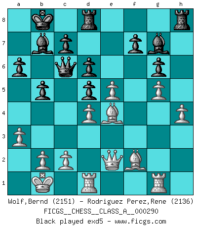 Last move : 1-0 2025 July 29 17:21:56 [Event "FICGS__CHESS__CLASS_A__000290"] [Site "FICGS"] [Date "2025.05.09"] [Round "1"] [White "Wolf,Bernd"] [Black "Rodriguez Perez,Rene"] [Result "1-0"] [WhiteElo "2151"] [BlackElo "2136"] 1.e4 d6 2.d4 Nf6 3.Nc3 g6 4.Be3 Bg7 5.Qd2 a6 6.f3 b5 7.O-O-O Nbd7 8.h4 Bb7 9.g4 h6 10.Nh3 Nb6 11.a3 h5 12.gxh5 Nxh5 13.Qe1 e6 14.Kb1 Qe7 15.Rg1 Nf6 16.Ng5 O-O-O 17.Bd3 Qe8 18.Bf2 Nh7 19.f4 Kb8 20.Qe2 Qd7 21.e5 Nxg5 22.fxg5 Qc6 23.Be4 Nd5 24.Nxd5 exd5 25.Bf3 Bc8 26.Rd3 dxe5 27.dxe5 Bf5 28.Rc3 Qe6 29.Re1 Qxe5 30.Qxe5 Bxe5 31.Rxe5 1-0 Follow this game move after move (download)Dazzling combinations are for the many, shifting wood is for the few. (Georg Kieninger) Viele Opfer benötigen überhaupt keine konkrete Berechnung. Es genügt sich die entstehende Position kurz vorzustellen, um uns davon zu überzeugen, dass das Opfer korrekt ist. (Mikhail Nekhemyevich Tal) El Ajedrez es un mar en el cual un mosquito puede beber y un elefante puede bañarse. (Refrán Hindú) Des points faibles ou des trous dans la position de l'adversaire doivent être occupés par des pièces et non pas par des pions. (Siegbert Tarrasch) It is not enough to be a good player... you must also play well. (Siegbert Tarrasch)