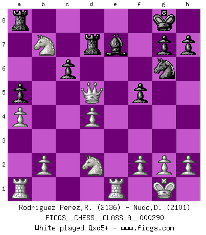 Last move : 1/2-1/2 2025 August 17 13:0:17 [Event "FICGS__CHESS__CLASS_A__000290"] [Site "FICGS"] [Date "2025.05.09"] [Round "1"] [White "Rodriguez Perez,Rene"] [Black "Nudo,Davide"] [Result "1/2-1/2"] [WhiteElo "2136"] [BlackElo "2101"] 1.e4 c6 2.d4 d5 3.e5 Bf5 4.Nf3 e6 5.Be2 Nd7 6.O-O a5 7.a4 f6 8.Bf4 Ne7 9.exf6 Nxf6 10.Bd3 Ng6 11.Bxf5 exf5 12.Bg5 Qd7 13.c4 dxc4 14.Qc2 Ne4 15.Nbd2 Nxg5 16.Nxg5 Be7 17.Rfe1 O-O 18.Ne6 Rf6 19.Qxc4 Qd5 20.Nc5 Rd6 21.Nxb7 Rd7 22.Qxd5+ Rxd5 23.Nb3 Bb4 24.Re3 f4 25.Rf3 Rb8 26.N7c5 Bxc5 27.dxc5 Ne5 28.Rc3 Rb4 29.g3 Nc4 30.gxf4 Nxb2 31.Nxa5 Rxa4 32.Rxa4 Nxa4 33.Rc4 Nxc5 34.Nxc6 Kf7 35.Ne5+ 1/2-1/2 Follow this game move after move (download)A chess genius has died; a loss for humanity. (Viktor Kortchnoi, about Bobby Fischer's death) Er war ein guter Schachspieler, aber ich kann Leute nicht ausstehen, die 'Heil Hitler' rufen (Über Alexander Aljechin). (Miguel Najdorf) No hay un Gran Maestro de Ajedrez que sea normal; solo se diferencían ellos por la magnitud de su locura. (Viktor Korchnoi) La guerre est enfant de la passion, la passion est enfant du narcissisme et le narcissisme est l'enfant. (...) Une autre partie ? (Thibault de Vassal) Once you start thinking you have nothing left to learn, you have everything to learn. (Steve Badget)