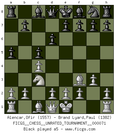 Last move : 0-1 2025 September 10 9:24:13 [Event "FICGS__CHESS__UNRATED_TOURNAMENT__000071"] [Site "FICGS"] [Date "2025.05.10"] [Round "1"] [White "Alencar,Ofir"] [Black "Brand Lyard,Paul"] [Result "0-1"] [WhiteElo "1557"] [BlackElo "1382"] 1.c4 c5 2.Nc3 Nc6 3.g3 d6 4.Bg2 Nd4 5.Nf3 Nxf3+ 6.Bxf3 a5 7.Nb5 Bd7 8.d4 Bxb5 9.cxb5 cxd4 10.e3 dxe3 11.fxe3 Qb6 12.a4 Qc5 13.Qd4 Qxd4 14.exd4 Rb8 15.Bf4 b6 16.Bc6+ Kd8 17.O-O-O Nf6 18.h3 Rc8 19.Bg5 Nh5 20.g4 h6 0-1 This chess game has been lost on time (started : 2025.05.10 8:32:20) Follow this game move after move (download)The passed Pawn is a criminal, who should be kept under lock and key. Mild measures, such as police surveillance, are not sufficient. (Aaron Nimzovich) Wer mein Gambit spielt, muß bereit sein, alle Brücken hinter sich abzubrechen. Es verändert den ganzen Menschen. Es wirkt wie ein Zauberstab und fördert verkümmerte, gute Charakter- eigenschaften wieder zu Tage. (Emil Joseph Diemer) Cualquier cambio de material en una posición debe venir por medio de un mate, una captura o promoción de Peón. (Purdy) À la honte des hommes, on sait que les lois du jeu sont les seules qui soient partout justes, claires, inviolables et exécutées. Pourquoi l'Indien qui a donné les règles du jeu d'échecs est-il obéi de bon gré dans toute la terre, et que les décrétales des papes, par exemple, sont aujourd'hui un objet d'horreur et de mépris ? C'est que l'inventeur des échecs combina tout avec justesse pour la satisfaction des joueurs, et que les papes, dans leurs décrétales, n'eurent en vue que leur seul avantage. L'Indien voulut exercer également l'esprit des hommes et leur donner du plaisir; les papes ont voulu abrutir l'esprit des hommes. Voltaire (Dictionnaire philosophique / Garnier 1967) Drag your thoughts away from your troubles... by the ears, by the heels, or any other way you can manage it. (Mark Twain)
