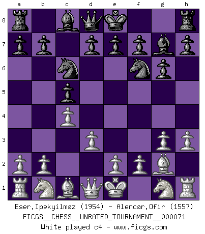 Last move : 1-0 2025 September 12 16:9:52 [Event "FICGS__CHESS__UNRATED_TOURNAMENT__000071"] [Site "FICGS"] [Date "2025.05.10"] [Round "1"] [White "Eser,Ipekyilmaz"] [Black "Alencar,Ofir"] [Result "1-0"] [WhiteElo "1954"] [BlackElo "1557"] 1.d3 c5 2.g3 Nc6 3.Bg2 g6 4.h3 Bg7 5.c3 Nf6 6.c4 Nd4 7.Nc3 Rb8 8.e3 Nc6 9.Nge2 d5 10.cxd5 Ne5 11.e4 1-0 This chess game has been lost on time (started : 2025.05.10 8:32:20) Follow this game move after move (download)It is difficult to play against Einstein's theory --on his first loss to Fischer. (Mikhail Tal) Es ist nicht das erste mal, dass sich die FIDE dem Arabischen Geld gebeugt hat (über die FIDE WM 2004 in Lybien). (Larry Evans) Te sientas frente a un tablero y repentinamente tu corazón brinca. Tu mano tiembla al tomar una pieza y moverla. Pero lo que el Ajedrez te enseña es que tu debes permanecer ahí con calma y pensar de que si realmente es una buena idea o de que si hay otras ideas mejores. (Stanley Kubrick) Les Echecs ne sont pas pour les âmes timides. Ils requièrent un homme entier, qui ne s'arrête pas aveuglément à ce qui a été déjà établi, mais qui tente individuellement de sonder les profondeurs du jeu. (W. Steinitz) The Movers & Shakers of this world are those who play chess in the mornings and go to the disco in the evenings. (Dinesh De Silva)