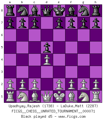 Last move : 0-1 2025 June 23 10:59:36 [Event "FICGS__CHESS__UNRATED_TOURNAMENT__000071"] [Site "FICGS"] [Date "2025.05.10"] [Round "1"] [White "Upadhyay,Rajesh"] [Black "LaDuke,Matt"] [Result "0-1"] [WhiteElo "1738"] [BlackElo "2287"] 1.d4 d5 2.Nf3 Nf6 3.Bf4 c5 4.e3 e6 5.Nbd2 Qb6 6.c4 Nc6 0-1 This chess game has been lost on time (started : 2025.05.10 8:32:20) Follow this game move after move (download)Chess is the art of analysis. (Mikhail Botvinnik) Frage des Reporters: -Worin besteht das Ziel von Gambiteröffnungen? Antwort: -Auf Kosten der Partie einen Ruf als Angriffspieler zu erwerben.- (Siegbert Tarrasch) La captura del Rey enemigo es la finalidad pero no el primer objetivo de la partida. (William Steinitz) La guerre est enfant de la passion, la passion est enfant du narcissisme et le narcissisme est l'enfant. (...) Une autre partie ? (Thibault de Vassal) You can't play chess if you're groggy from pills. (Anatoly Karpov)