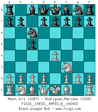 Last move : 1/2-1/2 2025 August 13 23:10:56 [Event "FICGS__CHESS__RAPID_B__000402"] [Site "FICGS"] [Date "2025.05.12"] [Round "1"] [White "Mach,Jiri"] [Black "Rodriguez,Mariano"] [Result "1/2-1/2"] [WhiteElo "2087"] [BlackElo "1928"] 1.e4 c5 2.Nf3 Nc6 3.d4 cxd4 4.Nxd4 Nf6 5.Nc3 e5 6.Ndb5 d6 7.Bg5 a6 8.Na3 b5 9.Nd5 Be7 10.Bxf6 Bxf6 11.c3 Bg5 12.Nc2 Rb8 13.a4 bxa4 14.Ncb4 Nxb4 15.cxb4 Bd7 16.Bxa6 O-O 17.O-O Kh8 18.Bc4 f5 19.exf5 Rxf5 20.b3 axb3 21.Qxb3 Be6 22.Rad1 Qc8 23.Ne3 Bxc4 24.Nxc4 Qg8 25.Qc2 R5f8 26.Nxd6 Be7 27.Qe4 Rf4 28.Qxe5 Bxd6 29.Rxd6 Rfxb4 30.Re1 R4b5 31.Qe4 Qf8 1/2-1/2 Follow this game move after move (download)The Pawns are the soul of the game. (Francois Andre Danican Philidor) Sicherlich können nur Meister einen Stil haben. Daß ein nicht-Meister auch nur ein einziges Mal in seinem Leben eine Partie folgerecht durchführte, habe ich niemals bemerkt. (Emanuel Lasker) Muchos jugadores de Ajedrez se sorprendían cuando después de la partida, Fischer explicaba con calma: 'Yo ya había analizado esta posibilidad' en una posición en la cual yo creía que no era posible de prever desde la apertura. (Mikhail Tal) Un footballeur joue avec ses pieds, parfois avec sa tête. Un joueur d'échecs ne joue qu'avec sa tête. Et quand il ne joue plus, il meurt. (Jacob Murray) Excelling at chess has long been considered a symbol of more general intelligence. That is an incorrect assumption in my view, as pleasant as it might be. But for the purposes of argument and investigation, chess is, in Russkin-Gutman's words, 'an unparalleled laboratory, since both the learning process and the degree of ability obtained can be objectified and quantified, providing an excellent comparative framework on which to use rigorous analytical techniques.' (The Chess Master and the Computer, by Garry Kasparov - 2010)