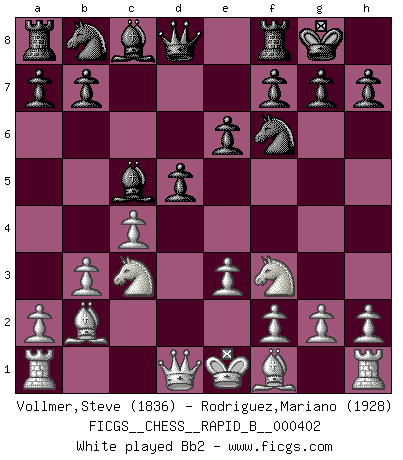 Last move : 0-1 2025 July 19 14:14:26 [Event "FICGS__CHESS__RAPID_B__000402"] [Site "FICGS"] [Date "2025.05.12"] [Round "1"] [White "Vollmer,Steve"] [Black "Rodriguez,Mariano"] [Result "0-1"] [WhiteElo "1836"] [BlackElo "1928"] 1.d4 Nf6 2.c4 e6 3.Nf3 d5 4.e3 Be7 5.Nc3 O-O 6.b3 c5 7.dxc5 Bxc5 8.Bb2 Nc6 9.Be2 dxc4 10.Bxc4 a6 11.a4 Qe7 12.O-O Bd7 13.Qe2 Na5 14.Ne5 Rfd8 15.Nxd7 Rxd7 16.Rfd1 Rad8 17.Rxd7 Rxd7 18.Rd1 Bd6 0-1 This chess game has been lost on time (started : 2025.05.12 14:53:26) Follow this game move after move (download)If you aren't afraid of Spassky, then I have removed the element of money. (Jim Slater) Wenn Du einsam bist, wenn Du Dich in der Welt wie ein Fremder fühlst, spiele Schach. Das wird Deinen Geist erheben und Dein Ratgeber im Kampf sein. (Aristoteles) La pasion por jugar al Ajedrez es una de las mas inexplicables en el mundo. (H.G. Wells) Je fais ceci parce que dans cinquante coups j'obtiendrai cela; je m'appelle Mikhail Moisevitch Botvinnik. (Botvinnik) In fact if nothing is done against this teddy bear, hereby I announce that I would quit chess, rapid chess, blitz chess, postal chess, email chess, server chess and correspondence chess I will then switch to a table game where teddy bears aren't going to be seen for a while, like Poker, or Roulette, all 18+ games. (Elmer Valderrama)