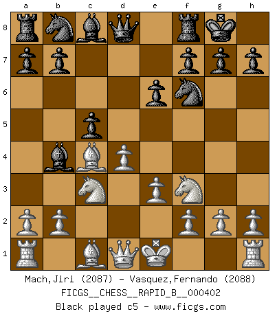Last move : 0-1 2025 August 22 20:25:53 [Event "FICGS__CHESS__RAPID_B__000402"] [Site "FICGS"] [Date "2025.05.12"] [Round "1"] [White "Mach,Jiri"] [Black "Vasquez,Fernando"] [Result "0-1"] [WhiteElo "2087"] [BlackElo "2088"] 1.d4 Nf6 2.c4 e6 3.Nc3 Bb4 4.e3 O-O 5.Bd3 d5 6.Nf3 dxc4 7.Bxc4 c5 8.O-O Nc6 9.a3 Ba5 10.h3 h6 11.Qd3 cxd4 12.exd4 Bc7 13.Rd1 Ne7 14.Ne5 b6 15.Qf3 Rb8 16.Qe2 Bb7 17.Nb5 Ra8 18.Nxc7 Qxc7 19.Bd2 Ne4 20.Bb4 a5 21.Bxe7 Qxe7 22.d5 Bxd5 23.Bxd5 exd5 24.Rxd5 Nf6 0-1 Follow this game move after move (download)Those who say they understand Chess, understand nothing. (Robert Hubner) Kasparov ist eine Art Monster mit hundert Augen, denen auch nicht das Geringste entgeht. (Tony Miles) Vive, pierde y aprende al observar a tu oponente como gana. (Amber Steenbock) Aidez vos pièces, elles vous aideront. (Paul Morphy) Programmer - an organism that turns coffee into software. (Anonymous)