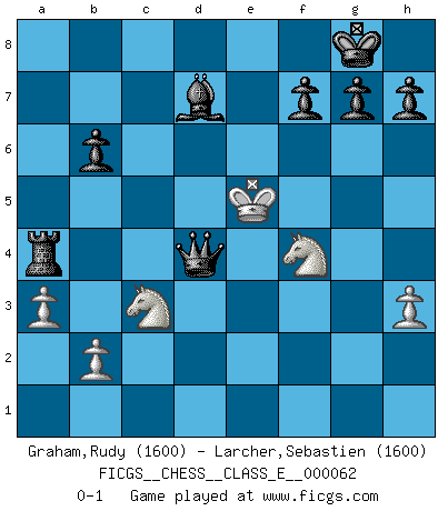 Last move : 0-1 2008 January 14 16:15:42 [Event "FICGS__CHESS__CLASS_E__000062"] [Site "FICGS"] [Date "2007.10.01"] [Round "1"] [White "Graham,Rudy"] [Black "Larcher,Sebastien"] [Result "0-1"] [WhiteElo "1600"] [BlackElo "1600"] 1.c4 e5 2.e3 Nf6 3.a3 Be7 4.d4 exd4 5.exd4 d5 6.c5 b6 7.cxb6 axb6 8.Bg5 Ne4 9.Bxe7 Qxe7 10.Ne2 O-O 11.f3 Nd6 12.g3 Qe3 13.Nbc3 Nc4 14.Qc2 Qxf3 15.Rg1 Ne3 16.Qd2 Bf5 17.Rc1 Re8 18.h3 c5 19.Nb5 Bd7 20.Nbc3 Nc6 21.dxc5 Ne5 22.Nxd5 Nxf1 23.Rxf1 Nd3+ 24.Qxd3 Qxd3 25.Ndf4 Qxg3+ 26.Kd2 Qe3+ 27.Kd1 Ba4+ 28.Ke1 Qxc1+ 29.Kf2 Qxc5+ 30.Kg3 Re3+ 31.Rf3 Rxf3+ 32.Kxf3 Bc6+ 33.Kg4 Ra4 34.Nc3 Qg1+ 35.Kf5 Bd7+ 36.Ke5 Qd4+ 0-1 English Opening Kingside Castling by player Black (move 10) Player Black won this chess game. Follow this game move after move (download)Chess is imagination. (David Bronstein) Im Leben werden Partien nie so unstrittig gewonnen wie im Spiel (Emanuel Lasker) No es tiempo de jugar al Ajedrez cuando la casa esta en llamas. (Proverbio Italiano) L'action d'une oeuvre littéraire se déroule sur un champ de bataille. Les masques et les types du drame moderne correspondent aux pièces du jeu d'échecs. L'intrigue correspond aux coups et aux gambits, c'est à dire aux techniques du jeu telles qu'utilisées et interprétées par les joueurs. Les tactiques et les péripéties [mouvements] correspondent aux coups exécutés par l'adversaire. (Viktor Shklovsky) An expert is a man who has made all the mistakes which can be made in a very narrow field. (Niels Bohr)