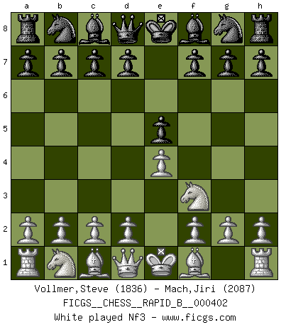 Last move : 1-0 2025 August 1 22:52:19 [Event "FICGS__CHESS__RAPID_B__000402"] [Site "FICGS"] [Date "2025.05.12"] [Round "1"] [White "Vollmer,Steve"] [Black "Mach,Jiri"] [Result "1-0"] [WhiteElo "1836"] [BlackElo "2087"] 1.e4 e5 2.Nf3 Nc6 3.Bb5 a6 4.Ba4 Nf6 5.O-O Be7 6.Re1 b5 7.Bb3 O-O 8.c3 d6 9.h3 Na5 10.Bc2 c5 11.d3 Re8 12.Be3 h6 13.Nbd2 Bb7 14.Nf1 Bf8 15.Ng3 d5 16.exd5 Nxd5 17.Bd2 Qc7 18.Nf5 1-0 Follow this game move after move (download)Mistrust is the most necessary characteristic of the Chess player. (Siegbert Tarrasch) Schach ist gnadenlos. Du mußt bereit sein zu töten. (Nigel Short) Un jugador que es sorprendido, esta derrotado a medias. (Proverbio) Le jeu d'échecs est comme rejeté hors du temps. (Antoine de Saint-Exupéry) Either move or be moved. (Ezra Pound)