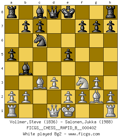 Last move : 0-1 2025 September 25 9:9:42 [Event "FICGS__CHESS__RAPID_B__000402"] [Site "FICGS"] [Date "2025.05.12"] [Round "1"] [White "Vollmer,Steve"] [Black "Salonen,Jukka"] [Result "0-1"] [WhiteElo "1836"] [BlackElo "1988"] 1.c4 e5 2.Nc3 Nf6 3.d3 d5 4.cxd5 Nxd5 5.Nf3 Bb4 6.Bd2 Nc6 7.g3 Nxc3 8.Bxc3 a5 9.Bg2 Qe7 10.O-O O-O 11.a3 Bxc3 12.bxc3 a4 13.Qc2 Be6 14.Nd2 Qc5 15.Qb2 Rfb8 16.Ne4 Qe7 17.Rfb1 Ra6 18.Qc1 Na5 19.Nd2 h5 20.h4 Bg4 21.Qe1 b5 22.e4 Qc5 23.Qe3 Qxc3 24.Rc1 Qd4 25.Qxd4 exd4 26.Rxc7 b4 27.axb4 Nb3 28.Ra2 Nxd2 29.Rxd2 Rxb4 30.Rc1 a3 31.f3 Be6 32.Kf2 Rb2 33.Ke2 Rab6 34.Bf1 Rxd2+ 35.Kxd2 Rb2+ 0-1 Follow this game move after move (download)Chess is a forcing house where the fruits of character can ripen more fully than in life. (Edward Morgan Foster) Über Kasparov: Es ist offensichtlich, daß er in einem totalitären Staat aufwuchs und deshalb zu diktatorischen Zügen neigt. (Viktor Kortschnoi) La pasion por jugar al Ajedrez es una de las mas inexplicables en el mundo. (H.G. Wells) Il n'y a pas de prix trop élevé au scalp de l'ennemi. (Koblentz) Ah, the Socrating method. The best way we have of teaching everything-apart from juggling chainsaws. (Gregory House, House M.D.)