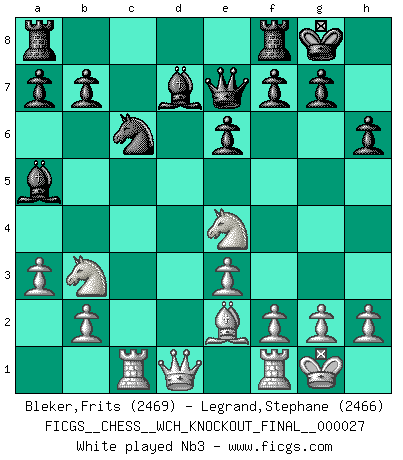 Last move : 1/2-1/2 2025 July 12 15:0:22 [Event "FICGS__CHESS__WCH_KNOCKOUT_FINAL__000027"] [Site "FICGS"] [Date "2025.05.15"] [Round "1"] [White "Bleker,Frits"] [Black "Legrand,Stephane"] [Result "1/2-1/2"] [WhiteElo "2469"] [BlackElo "2466"] 1.Nf3 Nf6 2.c4 e6 3.Nc3 d5 4.d4 Bb4 5.Bg5 h6 6.Bxf6 Qxf6 7.e3 O-O 8.Rc1 dxc4 9.Bxc4 c5 10.O-O cxd4 11.Ne4 Qe7 12.Nxd4 Bd7 13.Be2 Nc6 14.a3 Ba5 15.Nb3 Bc7 16.Nbc5 Be8 17.b4 Rd8 18.Qb3 b6 19.Na6 Be5 20.f4 f5 21.fxe5 fxe4 22.Rxf8+ Kxf8 23.Qc3 Qg5 24.Nc7 Bd7 25.Bb5 Qxe5 26.Bxc6 Qxc7 27.Qc4 Qd6 28.Qxe4 Bxc6 29.Rxc6 Qd1+ 30.Kf2 Rd2+ 31.Kg3 Qe1+ 32.Kg4 Qf2 33.Qf3+ Kg8 34.Qxf2 1/2-1/2 Follow this game move after move (download)Chess is not like life... it has rules ! (Mark Pasternak) Man wirke der falschen Auffassung entgegen, als ob jeder Zug Unmittelbares zu leisten habe; auch Werte- und Ruhezüge haben ihre Existenzberechtigung. (Aaron Nimzowitsch) La vida es como un juego de Ajedrez, cambiando con cada movimiento. (Proverbio Chino) Psychologiquement, tu dois avoir confiance en toi même, mais cette confiance doit être basée sur des faits. (Robert Fischer) In every real man a child is hidden that wants to play. (Friedrich Nietzsche)