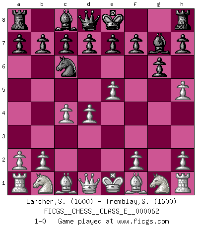 Last move : 1-0 2007 November 16 19:20:14 [Event "FICGS__CHESS__CLASS_E__000062"] [Site "FICGS"] [Date "2007.10.01"] [Round "1"] [White "Larcher,Sebastien"] [Black "Tremblay,Simon"] [Result "1-0"] [WhiteElo "1600"] [BlackElo "1600"] 1.e4 g6 2.c4 Bg7 3.d4 Nf6 4.e5 Nh5 5.g4 Nc6 6.gxh5 1-0 This chess game has been lost on time (started : 2007.10.01 12:2:13) Robatsch (Modern) defense Player White won this chess game. Follow this game move after move (download)The older I grow, the more I value Pawns. (Keres) Es hat in meinem Leben Zeiten gegeben, da ich sehr nahe daran war zu glauben, daß ich auch nicht eine einzige Schachpartie verlieren könnte. (José Raúl Capablanca) Morphy probablemente fue el genio más grande de todos. (Bobby Fischer) Le joueur d'Echecs qui veut atteindre le top est obligé de développer son propre credo créatif. Alexeï Stepanovicth Souétine. Il est facile d'écrire des livres ! Ce qui est difficile, c'est de jouer ! (Alexeï Stepanovicth Souétine) I live to kill Traxler counterattack. (Ilmars Cirulis)