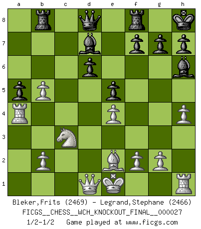 Last move : 1/2-1/2 2025 June 21 20:18:40 [Event "FICGS__CHESS__WCH_KNOCKOUT_FINAL__000027"] [Site "FICGS"] [Date "2025.05.15"] [Round "3"] [White "Bleker,Frits"] [Black "Legrand,Stephane"] [Result "1/2-1/2"] [WhiteElo "2469"] [BlackElo "2466"] 1.e4 c5 2.Nf3 Nc6 3.d4 cxd4 4.Nxd4 Nf6 5.Nc3 e5 6.Ndb5 d6 7.Bg5 a6 8.Na3 b5 9.Nd5 Be7 10.Bxf6 Bxf6 11.c3 Rb8 12.Nc2 Bg5 13.a4 bxa4 14.Ncb4 Nxb4 15.cxb4 O-O 16.Rxa4 a5 17.h4 Bh6 18.b5 Kh8 19.Be2 Bd7 20.Nc3 Rc8 21.Rc4 Rb8 22.Ra4 Rc8 23.Rc4 Rb8 24.Ra4 1/2-1/2 Follow this game move after move (download)Chess is a more highly symbolic game, but the aggressions are therefore even more frankly represented in the play. It probably began as a war game; that is, the representation of a miniature battle between the forces of two kingdoms. (Karl Meninger) Kostenjuk hat keinen Sexappeal. (Loek van Wely) Puntos débiles o agujeros en la posición de tu oponente deben de ser ocupados por piezas, no Peones. (Siegbert Tarrasch) Les échecs sont plus proches de l'art de l'assassinat que de l'art de la guerre. (Arturo Perez-Reverte) Whatever you do, don't be bored. This is absolutely the most exciting time we could have possibly hoped to be alive. And things are just starting. (From movie Waking life)