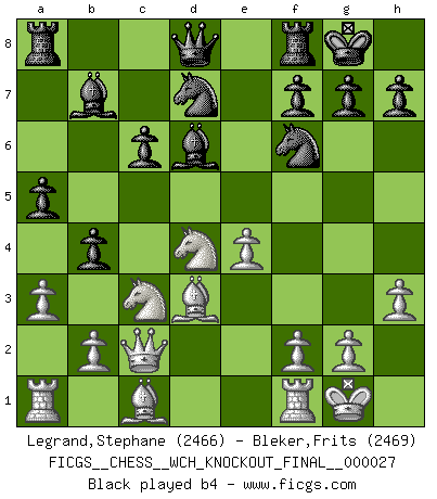 Last move : 1/2-1/2 2025 July 13 10:24:4 [Event "FICGS__CHESS__WCH_KNOCKOUT_FINAL__000027"] [Site "FICGS"] [Date "2025.05.15"] [Round "4"] [White "Legrand,Stephane"] [Black "Bleker,Frits"] [Result "1/2-1/2"] [WhiteElo "2466"] [BlackElo "2469"] 1.d4 d5 2.c4 c6 3.Nf3 Nf6 4.Nc3 e6 5.e3 Nbd7 6.Bd3 dxc4 7.Bxc4 b5 8.Bd3 Bb7 9.a3 Bd6 10.O-O O-O 11.Qc2 a5 12.e4 e5 13.h3 exd4 14.Nxd4 b4 15.Nf5 bxc3 16.Nxd6 Ne5 17.Nxb7 Qxd3 18.Qxc3 Qxc3 19.bxc3 Nxe4 20.Re1 f5 21.f3 Ra7 22.Nc5 Nxc5 23.Rxe5 Nd3 24.Be3 R7a8 25.Re7 Rfe8 26.Rxe8+ Rxe8 27.Bb6 a4 28.Rd1 Re1+ 29.Rxe1 Nxe1 30.Kf2 Nc2 31.Bc5 Kf7 32.Ke2 g5 33.Kd2 Na1 34.Bb6 h5 35.Kd3 f4 36.h4 Kg6 37.hxg5 Kxg5 38.Bg1 Kf5 39.c4 Nb3 40.Bb6 c5 1/2-1/2 Follow this game move after move (download)All my games are real. (Bobby Fischer) Ein Springer auf f6 gegen die eigene Rochadestellung ist schlimmer als ein rostiger Nagel im Knie. (Efim Bogoljubov) Fischer sacrificó virtualmente todo lo que la mayoría de nosotros los 'debiles' (término que él usa) valoramos, respetamos y apreciamos por el amor de un astuto, a menudo hermoso tablero de juego, por el privilegio ambivalente de ser su mas grande maestro. (Paul Kollar) Les échecs, c'est l'imagination. (David Bronstein) Computers are like Old Testament gods; lots of rules and no mercy. (Joseph Campbell)