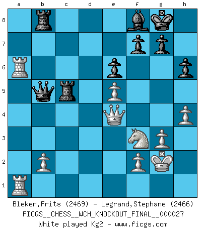 Last move : 1/2-1/2 2025 July 12 15:14:33 [Event "FICGS__CHESS__WCH_KNOCKOUT_FINAL__000027"] [Site "FICGS"] [Date "2025.05.15"] [Round "5"] [White "Bleker,Frits"] [Black "Legrand,Stephane"] [Result "1/2-1/2"] [WhiteElo "2469"] [BlackElo "2466"] 1.d4 Nf6 2.c4 e6 3.Nf3 d5 4.g3 Be7 5.Bg2 O-O 6.O-O dxc4 7.Qc2 a6 8.a4 Bd7 9.Qxc4 Bc6 10.Bg5 Nbd7 11.Nc3 h6 12.Bxf6 Nxf6 13.Rfd1 Qd6 14.e3 Rfd8 15.Qe2 Bf8 16.a5 Rab8 17.h4 Qe7 18.e4 Qb4 19.Qc2 Be8 20.Bf1 b6 21.e5 Nd5 22.Nxd5 Rxd5 23.axb6 Qxb6 24.Rxa6 Qb7 25.Qe4 Bb5 26.Bxb5 Qxb5 27.Rda1 c5 28.dxc5 Rxc5 29.Kg2 1/2-1/2 Follow this game move after move (download)Good positions don't win games, good moves do. (Gerald Abrahams) Wie ich sie so einen nach dem anderen nieder mähte wurde meine Überlegenheit offensichtlich. (José Raúl Capablanca) El Ajedrez es la vida. (Bobby Fischer) En blitz, le Cavalier l'emporte sur le Fou. (Vlastimil Hort) Pushing plastic is for the many, pushing virtual pieces is for the fewer, pushing wood is for the very few. (Normajean Yates)