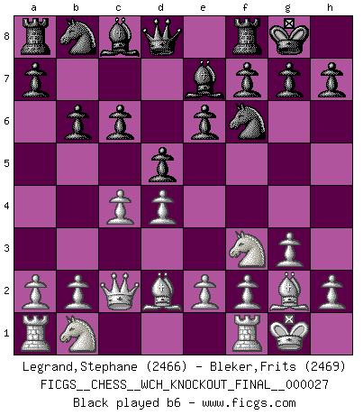 Last move : 0-1 2025 July 19 16:15:15 [Event "FICGS__CHESS__WCH_KNOCKOUT_FINAL__000027"] [Site "FICGS"] [Date "2025.05.15"] [Round "6"] [White "Legrand,Stephane"] [Black "Bleker,Frits"] [Result "0-1"] [WhiteElo "2466"] [BlackElo "2469"] 1.Nf3 Nf6 2.c4 e6 3.g3 d5 4.d4 Bb4+ 5.Bd2 Be7 6.Bg2 O-O 7.O-O c6 8.Qc2 b6 9.Rd1 Nbd7 10.Bf4 Bb7 11.Ne5 Nh5 12.Bd2 Nhf6 13.Bf4 Nh5 14.Bd2 Nhf6 15.cxd5 cxd5 16.Nc6 Bxc6 17.Qxc6 Rc8 18.Qb5 Ne8 19.e3 Nd6 20.Qe2 f5 21.a4 a5 22.Be1 Nf6 23.Nc3 Qd7 24.Rdc1 g5 25.Qd1 h5 26.Ne2 Kg7 27.Bf1 Nf7 28.Qb3 Rb8 29.Qb5 Qxb5 30.axb5 Rfc8 31.h4 Ng4 32.hxg5 Nxg5 33.Bd2 Nf3+ 0-1 Follow this game move after move (download)I give 98 percent of my mental energy to Chess. Others give only 2 percent. (Bobby Fischer) Dein Körper muss in Topform sein. Dein Schach verfällt, wenn dein Körper verfällt. Der Körper kann nicht vom Geist getrennt werden. (Robert James Fischer) Todo se encuentra en un estado de flujo y esto incluye al mundo del Ajedrez. (Mikhail Botvinnik) Soyez une menace à chaque fois que vous vous asseyez pour jouer. (Ken Smith) Your best chance to get a Royal Flush in a casino is in the bathroom. (Anonymous)