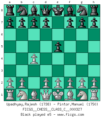 Last move : 1-0 2025 November 27 20:28:38 [Event "FICGS__CHESS__CLASS_C__000327"] [Site "FICGS"] [Date "2025.05.15"] [Round "1"] [White "Upadhyay,Rajesh"] [Black "Pintor,Manuel"] [Result "1-0"] [WhiteElo "1738"] [BlackElo "1750"] 1.c4 e5 2.Nc3 Nf6 3.g3 Bc5 4.Bg2 O-O 5.d3 h6 6.Nf3 d6 7.O-O Nc6 8.a3 Nd4 9.b4 Nxf3+ 10.Bxf3 Bd4 11.Bb2 Bh3 12.Re1 c6 13.Qb3 a6 14.a4 h5 15.e3 Ba7 16.b5 axb5 17.axb5 d5 18.cxd5 Bb6 19.Rxa8 Qxa8 20.bxc6 Qa6 21.Na4 Ba5 22.Ra1 bxc6 23.Nc5 Qb6 24.Qxb6 Bxb6 25.Na4 Bc7 26.dxc6 Bg4 27.Bg2 Rd8 28.Nc5 Be2 29.d4 exd4 30.Bxd4 Nd5 31.Ra7 Bb6 32.Rd7 Nf6 33.Rxd8+ Bxd8 34.Bxf6 Bxf6 35.c7 Bg4 36.Bb7 Be7 37.Ne4 g6 38.f3 Bd7 39.Kf2 f5 40.Nc3 h4 41.Nd5 hxg3+ 42.hxg3 Bd6 43.c8Q+ Bxc8 44.Bxc8 Kf7 45.f4 Kg7 46.Be6 Kh6 47.Kf3 Kg7 48.g4 fxg4+ 49.Kxg4 Bb8 50.Kg5 Bd6 51.e4 Bb8 52.e5 Ba7 53.Bg4 Bc5 54.Bf3 Ba3 55.Be4 1-0 Follow this game move after move (download)I'd rather have a Pawn than a finger. (Reuben Fine) Man kann eine Schachpartie nur gewinnen, wenn das Gleichgewicht gestört ist. In einer Stellung mit ungestörtem Gleichgewicht ist auch das größte Genie hilflos - in der Stellung steckt dann eben kein genialer Einfall. (Wilhelm Steinitz) Yo siempre he tenido un ligero sentimiento de lástima por una persona que no tiene conocimiento del Ajedrez. (Siegbert Tarrasch) J'apprécie les joueurs d'est-indienne, c'est grâce à eux que je nourris ma famille depuis tant d'années. (Petrosian) Two beer, or not two beer. (Unknown)