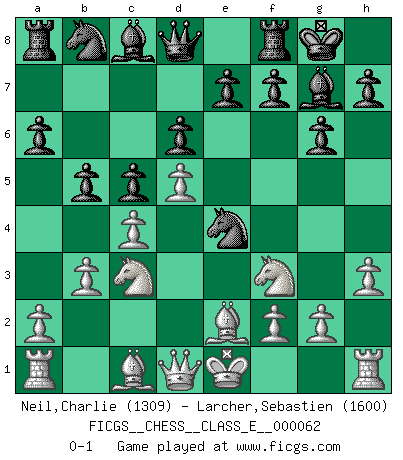 Last move : 0-1 2007 October 26 17:13:21 [Event "FICGS__CHESS__CLASS_E__000062"] [Site "FICGS"] [Date "2007.10.01"] [Round "1"] [White "Neil,Charlie"] [Black "Larcher,Sebastien"] [Result "0-1"] [WhiteElo "1309"] [BlackElo "1600"] 1.d4 g6 2.c4 Bg7 3.e4 c5 4.d5 d6 5.h3 Nf6 6.Nc3 O-O 7.Be2 a6 8.Nf3 b5 9.b3 Nxe4 0-1 Modern defense Kingside Castling by player Black (move 6) Player Black won this chess game. Follow this game move after move (download)Chess is a fairy tale of 1001 blunders. (Savielly Tartakower) Gegen einen Schachcomputer zu verlieren ist wie Löcher in den Strümpfen zuhaben. Es ist nicht peinlich, solange man der einzige ist der es weiß. (Anonymous) El arma más poderosa en el Ajedrez, es tener la próxima movida. (David Bronstein) Mais n'est-ce pas déjà le limiter injurieusement que d'appeler les échecs un jeu? N'est-ce pas aussi une science, un art, ou quelque chose qui, comme le cercueil de Mahomet entre ciel et terre, est suspendu entre l'un et l'autre, et qui réunit un nombre incroyable de contraires ? (Stefan Zweig) The bottom line is always the bottom line. (Johann Piek)