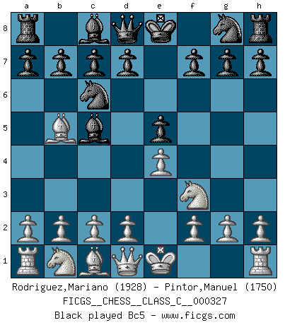 Last move : 1-0 2025 June 20 2:2:1 [Event "FICGS__CHESS__CLASS_C__000327"] [Site "FICGS"] [Date "2025.05.15"] [Round "1"] [White "Rodriguez,Mariano"] [Black "Pintor,Manuel"] [Result "1-0"] [WhiteElo "1928"] [BlackElo "1750"] 1.e4 e5 2.Nf3 Nc6 3.Bb5 Bc5 4.c3 Qf6 5.d4 exd4 6.e5 Qg6 7.cxd4 Nxd4 8.Nxd4 Qxg2 9.Qf3 Qg6 10.Bd3 Qb6 11.Nb3 Bb4+ 12.Nc3 Ne7 13.O-O Bxc3 14.bxc3 O-O 15.Qg3 d6 16.exd6 Qxd6 17.Qxd6 cxd6 18.Re1 Nd5 19.Bd2 b6 20.Be4 Be6 21.c4 Nf6 22.Bxa8 Rxa8 23.Rac1 h6 24.Bf4 d5 25.Nd4 Bh3 26.Re3 Bd7 27.c5 bxc5 28.Rxc5 Rc8 29.Rxc8+ Bxc8 30.Rc3 Be6 31.f3 g5 32.Bc7 Kh7 33.Nxe6 fxe6 34.Rc6 Ne8 35.Be5 Ng7 36.Rc7 1-0 Follow this game move after move (download)What would Chess be without silly mistakes ? (Kurt Richter) Die jungen Leute sollen verstehen, dass sie noch etwas von mir lernen können und müssen. (Viktor Kortschnoi) ¿Esta Bobby Fischer algo cuerdo?. (Salo Flohr) Tout change constamment, y compris dans le monde des Echecs. (Botvinnik) Strategy without tactics is the slowest route to victory. Tactics without strategy is the noise before defeat. (Sun Tzu)
