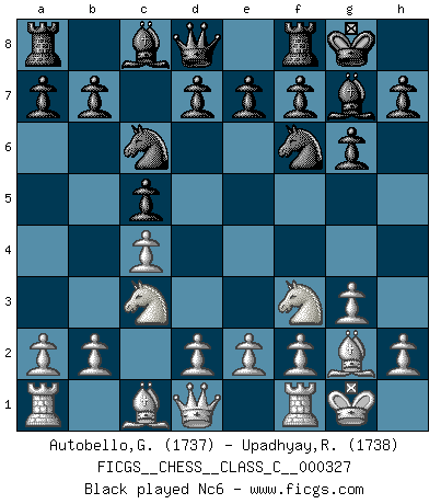 Last move : 1-0 2025 October 27 10:42:26 [Event "FICGS__CHESS__CLASS_C__000327"] [Site "FICGS"] [Date "2025.05.15"] [Round "1"] [White "Autobello,Giovanni"] [Black "Upadhyay,Rajesh"] [Result "1-0"] [WhiteElo "1737"] [BlackElo "1738"] 1.c4 c5 2.Nf3 Nf6 3.g3 g6 4.Bg2 Bg7 5.O-O O-O 6.Nc3 Nc6 7.d4 cxd4 8.Nxd4 d6 9.e4 Nxd4 10.Qxd4 Be6 11.Be3 Nd5 12.Qd3 Nxc3 13.bxc3 Qc7 14.Rfb1 b6 15.e5 Bxe5 16.Bxa8 1-0 This chess game has been lost on time (started : 2025.05.15 16:13:9) Follow this game move after move (download)In a gambit you give up a Pawn for the sake of getting a lost game. (Samuel Standige Boden) Es macht mich traurig, wenn ich sehe, dass Golfprofis mehr verdienen als Schachsportler. Obwohl ich davon überzeugt bin, dass wir Schachspieler viel härter trainieren müssen als die Golfer. (Alexandra Kosteniuk) El pensamiento metódico es mas útil en el Ajedrez que la inspiración. (C. J. S. Purdy) Aux échecs, les retours au sommet sont rares : les dommages psychologiques consécutifs à une défaite sont trop sévères. (Daily Telegraph) The existence of forgetting has never been proved: We only know that some things don't come to mind when we want them. (Friedrich Nietzsche)