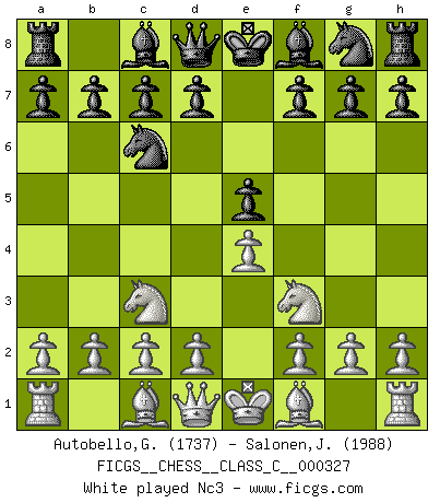 Last move : 0-1 2025 August 21 18:34:22 [Event "FICGS__CHESS__CLASS_C__000327"] [Site "FICGS"] [Date "2025.05.15"] [Round "1"] [White "Autobello,Giovanni"] [Black "Salonen,Jukka"] [Result "0-1"] [WhiteElo "1737"] [BlackElo "1988"] 1.e4 e5 2.Nf3 Nc6 3.Nc3 Nf6 4.Bc4 Nxe4 5.Bxf7+ Kxf7 6.Nxe4 d5 7.Neg5+ Kg8 8.O-O h6 9.Nh3 Bg4 10.Qe1 e4 11.Nf4 exf3 12.Ng6 fxg2 13.Kxg2 Qg5 14.Nxh8 Be2 0-1 Follow this game move after move (download)You need not play well - just help your opponent to play badly. (Genrikh Chepukaitis) Ich verachte Kasparow. (Viktor Kortschnoi) El juego de Fischer siempre fue nítido, racional y brillante. Uno de los mejores por siempre. (Dave Regis) Ce qui caractérise les parties de combat, c'est que si le défenseur a constamment de difficiles problèmes à résoudre, l'attaquant doit chercher sans relâche de nouvelles possibilités d'attaque. (Koblentz) The faster the computer, the slower the brain. (Thibault de Vassal)