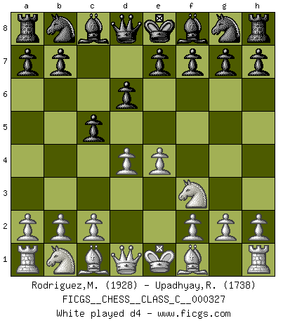 Last move : 1-0 2025 August 11 6:14:44 [Event "FICGS__CHESS__CLASS_C__000327"] [Site "FICGS"] [Date "2025.05.15"] [Round "1"] [White "Rodriguez,Mariano"] [Black "Upadhyay,Rajesh"] [Result "1-0"] [WhiteElo "1928"] [BlackElo "1738"] 1.e4 c5 2.Nf3 d6 3.d4 cxd4 4.Nxd4 Nf6 5.Nc3 a6 6.Bg5 e6 7.f4 h6 8.Bh4 Qb6 9.a3 Nc6 10.Bf2 Qc7 11.Qf3 Bd7 12.O-O-O b5 13.e5 Rb8 14.exf6 Nxd4 15.Bxd4 Bc6 16.fxg7 Bxg7 17.Qd3 1-0 Follow this game move after move (download)The game of Chess is not merely an idle amusement; several very valuable qualities of the mind are to be acquired and strengthened by it, so as to become habits ready on all occasions; for life is a kind of Chess. (Benjamin Franklin) Das ganze Leben mit einer Ehefrau ist wie ein Endspiel mit ungleichfarbigen Läufern. (Viktor Kortschnoi) La belleza de un movimiento no se refleja solo en su apariencia, sino en el pensamiento detrás de él. (Siegbert Tarrasch) Psychologiquement, tu dois avoir confiance en toi même, mais cette confiance doit être basée sur des faits. (Robert Fischer) A person who never made a mistake never tried anything new. (Albert Einstein)