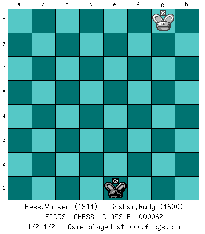 Last move : 1/2-1/2 2008 February 7 17:16:42 [Event "FICGS__CHESS__CLASS_E__000062"] [Site "FICGS"] [Date "2007.10.01"] [Round "1"] [White "Hess,Volker"] [Black "Graham,Rudy"] [Result "1/2-1/2"] [WhiteElo "1311"] [BlackElo "1600"] 1.c4 g6 2.Nc3 e5 3.g3 c6 4.Bg2 Bb4 5.Nf3 f6 6.O-O d6 7.d3 h6 8.Bd2 Be6 9.Nh4 g5 10.Nf3 h5 11.Rb1 Ba5 12.a3 d5 13.cxd5 cxd5 14.Na4 g4 15.Bxa5 Qxa5 16.Nh4 Kf7 17.b4 Qc7 18.Nc5 Ne7 19.Nxe6 Kxe6 20.Qb3 Qd6 21.e4 Kf7 22.Nf5 Nxf5 23.exf5 Rd8 24.Rbc1 Nc6 25.Rc5 Nd4 26.Bxd5+ Kg7 27.Qa2 Nxf5 28.Rd1 b6 29.Bxa8 bxc5 30.Be4 Nd4 31.bxc5 Qxc5 32.Rb1 Nf3+ 33.Kg2 Ng5 34.Rb7+ Kh6 35.Qd2 Rh8 36.Qe3 Qxe3 37.fxe3 Nxe4 38.dxe4 Rc8 39.Rxa7 Rc2+ 40.Kg1 Re2 41.a4 Rxe3 42.Ra8 Rxe4 43.a5 Kg5 44.a6 Re1+ 45.Kf2 Ra1 46.a7 Kf5 47.Ke3 Ra2 48.Rh8 Rxa7 49.Rxh5+ Kg6 50.Rh8 Kf5 51.Rh5+ Kg6 52.Rh4 Kg5 53.Rh8 Ra3+ 54.Ke4 Ra4+ 55.Kd5 Kf5 56.Kd6 Ke4 57.Rh4 Kf3 58.Ke6 Ra6+ 59.Kf5 e4 60.Rxg4 e3 61.Rf4+ Kg2 62.Re4 Ra3 63.Kxf6 Kxh2 64.g4 Kg3 65.g5 Kf3 66.Re7 e2 67.g6 Kf2 68.g7 Rg3 69.Kf7 e1Q 70.Rxe1 Kxe1 71.g8Q Rxg8 72.Kxg8 1/2-1/2 English Opening Kingside Castling by player White (move 6) 10 pieces endgame at move 48 : White KRPP , Black KRPPPP WHITE : King + 1 Rook 2 Pawns BLACK : King + 1 Rook 4 Pawns 9 pieces endgame at move 49 : White KRPP , Black KRPPP WHITE : King + 1 Rook 2 Pawns BLACK : King + 1 Rook 3 Pawns 8 pieces endgame at move 60 : White KRPP , Black KRPP WHITE : King + 1 Rook 2 Pawns BLACK : King + 1 Rook 2 Pawns 7 pieces endgame at move 63 : White KRPP , Black KRP WHITE : King + 1 Rook 2 Pawns BLACK : King + 1 Rook 1 Pawn 6 pieces endgame at move 63 : White KRP , Black KRP WHITE : King + 1 Rook 1 Pawn BLACK : King + 1 Rook 1 Pawn Promotion Queen by player Black (move 69) 5 pieces endgame at move 70 : White KRP , Black KR WHITE : King + 1 Rook 1 Pawn BLACK : King + 1 Rook 4 pieces endgame at move 70 : White KP , Black KR WHITE : King + 1 Pawn BLACK : King + 1 Rook Promotion Queen by player White (move 71) 3 pieces endgame at move 71 : White K , Black KR WHITE : King + BLACK : King + 1 Rook 2 pieces endgame at move 72 : White K , Black K WHITE : King + BLACK : King + This chess game ended in a draw. Follow this game move after move (download)Play the opening like a book, the middle game like a magician, and the endgame like a machine. (Spielmann) Karpov ist ein Museumsstück. (Garry Kasparov) Cuando me preguntan: -¿Cual es el secreto que te hace hacer mejores movidas que tus oponentes?, Yo respondo: Me da gusto que me pregunten eso, porque, como veran, hay una simple razón. Yo pienso mis propias movidas y dejo a mi oponente que el piense las suyas. (Alexander Alekhine) Nous vivons dans un monde échiquéen : chaque jour qui passe est un défi à relever. (Philosophe Sasha) Difficult things take a long time, impossible things a little longer. (Author unknown)