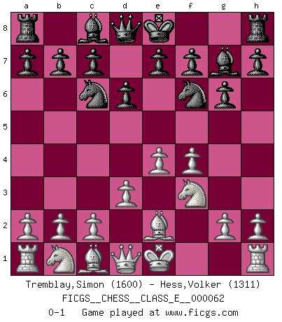 Last move : 0-1 2007 November 14 19:13:46 [Event "FICGS__CHESS__CLASS_E__000062"] [Site "FICGS"] [Date "2007.10.01"] [Round "1"] [White "Tremblay,Simon"] [Black "Hess,Volker"] [Result "0-1"] [WhiteElo "1600"] [BlackElo "1311"] 1.f4 d6 2.Nf3 Nf6 3.d3 g6 4.e4 Bg7 5.Be2 Nc6 0-1 This chess game has been lost on time (started : 2007.10.01 12:2:13) Bird's Opening Player Black won this chess game. Follow this game move after move (download)War is the child of passion, passion is the child of narcissism and narcissism is the child. (...) Another game ? (Thibault de Vassal) Ich war zu klein für die Schach-Schülermannschaft! (Woody Allen) No soy una persona materialista y por eso, no resiento la falta o pérdida del dinero. La ausencia de cosas mundanas carece de importancia. Ya que el Ajedrez es una forma en la que puedo ser tan materialista como yo desee sin tener la necesidad de vender mi alma. (Jamie Walter Adams) Pour se monter efficace, un Cavalier a besoin d'avant-postes ! Les Cavaliers font les meilleurs bloqueurs de pions passés. True nature is revealed in times of difficulty. (Chinese proverb)