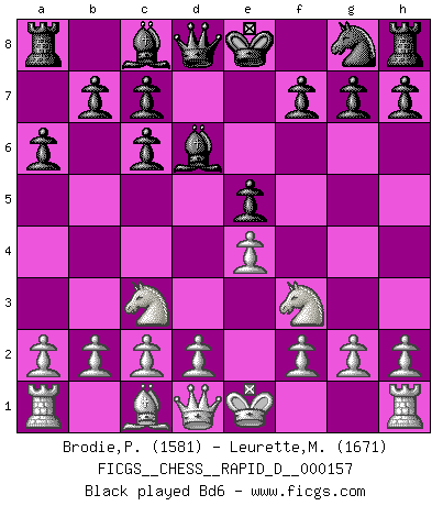 Last move : 0-1 2025 June 16 18:5:0 [Event "FICGS__CHESS__RAPID_D__000157"] [Site "FICGS"] [Date "2025.05.15"] [Round "1"] [White "Brodie,Peter"] [Black "Leurette,Marc-Antoine"] [Result "0-1"] [WhiteElo "1581"] [BlackElo "1671"] 1.e4 e5 2.Nf3 Nc6 3.Bb5 a6 4.Bxc6 dxc6 5.Nc3 Bd6 6.d3 Nf6 7.O-O O-O 8.Bg5 h6 9.Bh4 Re8 10.d4 exd4 11.Nxd4 Be5 12.Nf5 Bxf5 13.exf5 Bxc3 14.bxc3 Qxd1 15.Raxd1 Ne4 16.c4 f6 17.Rd3 Nc5 18.R3d1 b5 19.cxb5 cxb5 20.Rd5 Na4 21.f3 Nc3 22.Rc5 Ne2+ 23.Kh1 Ra7 24.Re1 Kf7 25.Bf2 Rb7 26.Rd5 Nc3 27.Rxe8 Nxd5 28.Bd4 Kxe8 29.Kg1 Nb4 30.c3 Nxa2 0-1 Follow this game move after move (download)Strategy requires thought, tactics require observation. (Max Euwe) Im Spitzenschach von heute geht es nur um Vorbereitung, um tiefgründige, sorgfältige Eröffnungsvorbereitung. (Nigel Short) Los Peones son nacidos libres, y aún así, se encuentran por doquier encadenados. (Rick Kennedy) Tout change constamment, y compris dans le monde des Echecs. (Botvinnik) Faith : not wanting to know what is true. (Friedrich Nietzsche)