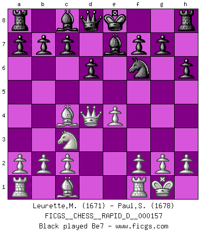 Last move : 1-0 2025 May 27 18:40:13 [Event "FICGS__CHESS__RAPID_D__000157"] [Site "FICGS"] [Date "2025.05.15"] [Round "1"] [White "Leurette,Marc-Antoine"] [Black "Paul,Samagata"] [Result "1-0"] [WhiteElo "1671"] [BlackElo "1678"] 1.e4 e5 2.Nf3 Nc6 3.Bc4 h6 4.d4 exd4 5.Nxd4 Nxd4 6.Qxd4 d6 7.Nc3 Nf6 8.O-O Be7 9.e5 dxe5 10.Qxd8+ Bxd8 11.Re1 O-O 12.Rxe5 c6 13.Bd2 Bc7 14.R5e1 Bf5 15.Rac1 b5 16.Bb3 a5 17.a4 b4 18.Ne2 Rad8 19.c3 Rxd2 20.Nd4 Bg6 21.Nxc6 Rxb2 22.cxb4 Rxb3 23.bxa5 Bd6 24.a6 Ra3 25.Red1 Bf4 26.Rc4 Nh7 27.Rxf4 Ra8 28.a7 Nf8 29.Rb4 1-0 Follow this game move after move (download)Weak points or holes in the opponent's position must be occupied by pieces not Pawns. (Siegbert Tarrasch) Gewinnen beim Schach fördert das Selbstvertrauen. Beim Sex spüre ich sowas nicht... (Garry Kasparov) Aquel que ve no otra dirección en el juego que la de dar Jaque Mate a su oponente, nunca será un buen jugador de Ajedrez. (Euwe) La conception d'un plan est le processus par lequel un joueur exploite les avantages de sa position tout en s'efforçant d'en réduire au minimum les inconvénients. Afin de garantir le succès, un plan doit toujours se fonder sur un diagnostic objectif des particularités d'une position. La conception d'un plan est d'autant plus difficile que la position est équilibrée, et grandement facilitée lorsqu'il n'existe qu'un seul plan susceptible de répondre aux exigences de la position. (Harry Golombek) A cynic is a man who knows the price of everything but the value of nothing. (Oscar Wilde)