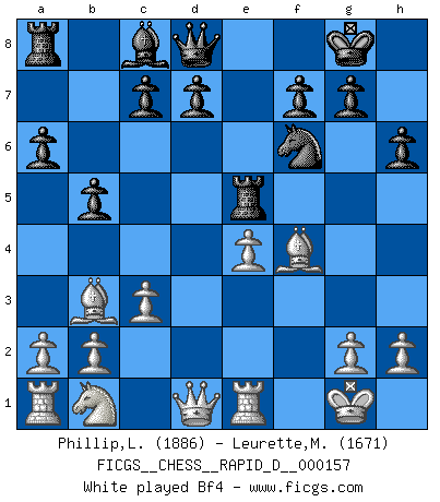 Last move : 1-0 2025 May 20 18:13:49 [Event "FICGS__CHESS__RAPID_D__000157"] [Site "FICGS"] [Date "2025.05.15"] [Round "1"] [White "Phillip,Lennox"] [Black "Leurette,Marc-Antoine"] [Result "1-0"] [WhiteElo "1886"] [BlackElo "1671"] 1.e4 e5 2.Nf3 Nc6 3.Bb5 a6 4.Ba4 b5 5.Bb3 Nf6 6.O-O Be7 7.Re1 O-O 8.c3 Re8 9.d4 Bd6 10.Ng5 Rf8 11.f4 h6 12.fxe5 Bxe5 13.Nf3 Re8 14.Nxe5 Nxe5 15.dxe5 Rxe5 16.Bf4 Rxe4 17.Rxe4 Nxe4 18.Bxf7+ Kxf7 19.Qd5+ Kf8 20.Qxa8 Nf6 21.Qf3 d6 22.Nd2 d5 23.Be5 c6 24.Rf1 Qb6+ 25.Kh1 1-0 Follow this game move after move (download)Different people feel differently about resigning. (Bobby Fischer) Ein typischer, sehr verbreiteter Gedankenschädling ist der, daß der betreffende Amateur von der Annanhme ausgeht, daß jeder einzelne Zug etwas zu leisten habe. (Aaron Nimzowitsch) Me siento como si fuera una pieza en una partida de Ajedrez, cuando mi oponente me indica: esa pieza no puede ser movida. (Soren Kierkegaard) Des idées, des idées, j'en ai cent, j'en ai mille. Des bonnes, des mauvaises, applicables, irréalisables... Il suffit de faire le tri ! (Roos) Happy endings are just stories that haven't finished yet. (Jane Smith in Mr & Mrs Smith)
