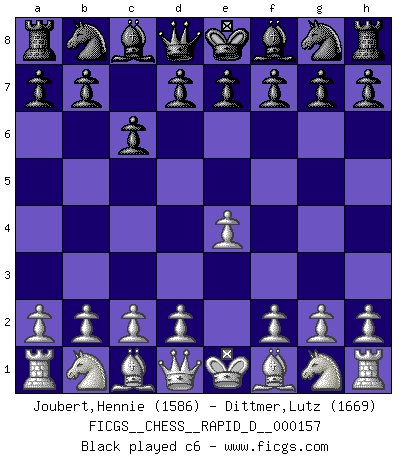 Last move : 1-0 2025 May 23 11:27:8 [Event "FICGS__CHESS__RAPID_D__000157"] [Site "FICGS"] [Date "2025.05.15"] [Round "1"] [White "Joubert,Hennie"] [Black "Dittmer,Lutz"] [Result "1-0"] [WhiteElo "1586"] [BlackElo "1669"] 1.e4 c6 2.d4 d6 3.c4 1-0 Follow this game move after move (download)Bobby Fischer is the greatest Chess player who has ever lived. (Ken Smith) Es gibt Leute, die glauben, alles wäre vernünftig, was man mit einem ernsthaften Gesicht tut. (Georg Christoph Lichtenberg) El Ajedrez es un regaderazo frío para la mente. (Sir John Simon) Toutes choses étant égales, c'est la conviction qui gagne. Alliée à une volonté de vaincre, elle sert de détonateur, suscite des idées, disperse les doutes et aide à penser clairement. (Robert Fischer) I find television to be very educating. Every time somebody turns on the set, I go in the other room and read a book. (Groucho Marx)