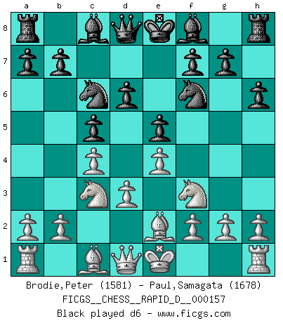 Last move : 0-1 2025 July 17 10:55:5 [Event "FICGS__CHESS__RAPID_D__000157"] [Site "FICGS"] [Date "2025.05.15"] [Round "1"] [White "Brodie,Peter"] [Black "Paul,Samagata"] [Result "0-1"] [WhiteElo "1581"] [BlackElo "1678"] 1.c4 e5 2.e4 c5 3.Nc3 Nf6 4.Nf3 Nc6 5.d3 h6 6.Be2 d6 7.O-O Be7 8.Be3 Nd4 9.b3 O-O 10.Nd5 Nxe2+ 11.Qxe2 Nxd5 12.cxd5 f5 13.Nd2 f4 14.Bxf4 Rxf4 15.g3 Rf8 16.f3 a6 17.Rfc1 Bg5 18.h4 Bxh4 19.gxh4 Qxh4 20.Qh2 Qg5+ 21.Qg2 Qe3+ 22.Qf2 Qxd3 23.Nc4 Rf6 24.Nd2 Bg4 25.Kg2 Raf8 26.Rf1 Bxf3+ 27.Nxf3 Qxe4 28.Rad1 Rxf3 29.Qxf3 Rxf3 30.Rxf3 Qe2+ 31.Rf2 Qxd1 32.Rf1 Qxd5+ 33.Kg1 Qd4+ 34.Rf2 e4 35.Kf1 e3 36.Re2 d5 0-1 Follow this game move after move (download)Becoming successful at Chess allows you to discover your own personality. That's what I want for the kids I teach. (Saudin Robovic) Matt entspricht nicht immer den Tatsachen. (Savielly Grigorievitsch Tartakower) Si tu oponente no puede hacer nada activo, entonces no apures la posición; En vez de eso, dejalo estar sentado ahí, sufriendo y rogandote por un empate. (Jeremy Silman) Si rien de grave n'est détecté lors de l'analyse d'une position, on joue alors le coup. Seconde règle de Blumenfeld. You must have a dream in order to have it come true. (A.P.J. Kalam)