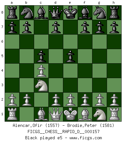 Last move : 0-1 2025 August 5 10:0:35 [Event "FICGS__CHESS__RAPID_D__000157"] [Site "FICGS"] [Date "2025.05.15"] [Round "1"] [White "Alencar,Ofir"] [Black "Brodie,Peter"] [Result "0-1"] [WhiteElo "1557"] [BlackElo "1581"] 1.c4 c5 2.Nc3 e5 3.g3 Nc6 4.Nd5 Nf6 5.Nxf6+ Qxf6 6.e3 d6 7.Bg2 Be7 8.Bxc6+ bxc6 9.b3 O-O 10.Qf3 Qxf3 11.Nxf3 e4 12.Ng1 Bf6 13.Rb1 Bd7 14.h4 h5 15.Ne2 Rfe8 16.Nf4 g6 17.Bb2 Be5 0-1 This chess game has been lost on time (started : 2025.05.15 19:9:25) Follow this game move after move (download)Good positions don't win games, good moves do. (Gerald Abrahams) Die meiste Zeit treffe ich auf Gegner, die meine Enkel sein könnten. Ich bin da, um ihnen zu zeigen, dass sie von mir noch einiges lernen können. (Viktor Kortschnoi) Nos gusta pensar. (Gary Kasparov) On a dit que l'homme se distingue de l'animal par le fait qu'il achète plus de livres qu'il ne peut en lire. Je voudrais suggérer qu'inclure à la liste des livres quelques livres d'échecs rendrait la distinction manifeste. (Edward Lasker) If passion drives you, let reason holds the reins. (Benjamin Franklin)