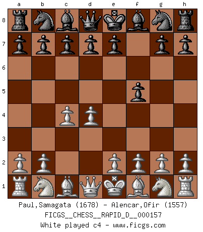 Last move : 1-0 2025 June 30 16:2:29 [Event "FICGS__CHESS__RAPID_D__000157"] [Site "FICGS"] [Date "2025.05.15"] [Round "1"] [White "Paul,Samagata"] [Black "Alencar,Ofir"] [Result "1-0"] [WhiteElo "1678"] [BlackElo "1557"] 1.d4 f5 2.c4 Nf6 3.Nc3 b6 4.Bf4 Ne4 5.Nxe4 fxe4 6.e3 d5 7.Ne2 Nc6 8.Nc3 g6 9.a3 h5 10.b4 dxc4 11.Bxc4 e6 12.O-O a5 13.bxa5 bxa5 14.Na4 Bd6 15.Nc5 Bxc5 16.dxc5 Qxd1 17.Rfxd1 Ke7 18.Bxc7 Ra7 19.Bb6 Rb7 20.Bb5 Bd7 21.Bxc6 Bxc6 22.Bxa5 Ra8 23.Bb4 Rd8 24.Rxd8 Kf6 25.Rad1 1-0 Follow this game move after move (download)In complicated positions, Bobby Fischer hardly had to be afraid of anybody. (Paul Keres) Wer nie einen Fehler gemacht hat, hat nie etwas Neues ausprobiert. (Albert Einstein) En partidas rápidas, el Caballo es mas poderoso que el Alfil. (Vlastimil Hort) C'est une question de caractère, Beaucoup de gens perdent leur motivation très vite. D'autres, ils sont rares, peuvent la conserver très longtemps. J'aime les échecs, encore aujourd'hui je suis heureux d'analyser des parties. J'aime toujours gagner, je déteste encore perdre. Bien jouer est important pour mon intégrité intellectuelle et morale. Et puis les échecs vivent en ce moment une période historique grâce à Internet. Ils se développent dans les systèmes éducatifs à travers le monde. Ils sortent de leur ghetto, et c'est mon rôle de mener à bien cette révolution. (Gary Kasparov) It is the aim of the modern school, not to treat every position according to one general law, but according to the principle inherent in the position. (Richard Reti)