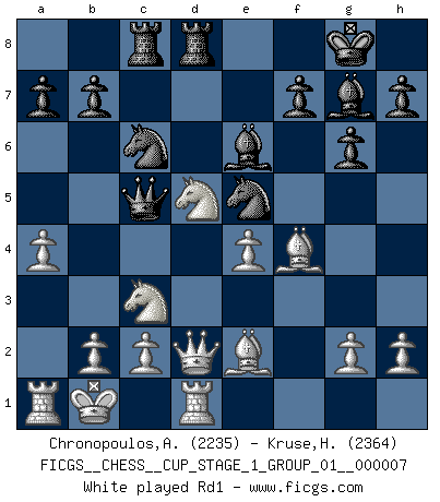 Last move : 1/2-1/2 2025 July 16 22:54:8 [Event "FICGS__CHESS__CUP_STAGE_1_GROUP_01__000007"] [Site "FICGS"] [Date "2025.05.16"] [Round "1"] [White "Chronopoulos,Antonis"] [Black "Kruse,Herbert"] [Result "1/2-1/2"] [WhiteElo "2235"] [BlackElo "2364"] 1.d4 g6 2.e4 Bg7 3.f4 d6 4.Nc3 Nf6 5.Be3 Ng4 6.Bc1 O-O 7.Be2 Nf6 8.Be3 c5 9.dxc5 Nc6 10.Bf3 e5 11.cxd6 exf4 12.Bxf4 Qb6 13.Nge2 Ng4 14.Nd5 Qf2+ 15.Kd2 Nge5 16.Kc1 Qc5 17.Nec3 Rd8 18.Be2 Be6 19.a4 Qxd6 20.Kb1 Rac8 21.Qd2 Qc5 22.Rd1 Nc4 23.Bxc4 Qxc4 24.Ra3 f5 25.Bh6 Be5 26.Rb3 Rd7 27.Qe1 fxe4 28.Ne3 Rxd1+ 29.Qxd1 Qa6 30.Ned5 Qc4 31.Ne3 Qa6 32.Ned5 Qc4 33.Ne3 1/2-1/2 Follow this game move after move (download)It is not enough to be a good player... you must also play well. (Siegbert Tarrasch) Es ist schade, dass viele Schachsportler vergessen, wie wichtig Auftreten und angemessene Kleidung sind. (Alexandra Kosteniuk) Ser exitoso en el Ajedrez te permite descubrir tu propia personalidad. Eso es lo que deseo para los niños de mi clase. (Saudin Robovic) Le temps de noter son nom sur la feuille de partie, j'étais déjà en zeitnot ! D'un modeste amateur apparié lors de la première ronde d'un open contre le grand-maître Azmaïparashvili. Methinks King Thibault should dub Marius Zubac a knight of the square board... I mean table, henceforth addressing him as Sir Marius, and bestow on him a suitable land from the kingdom of FICGS & marry him off to a worthy, fair maiden, lest he slice our heads with his mighty sword in his wrath. (Dinesh De Silva)