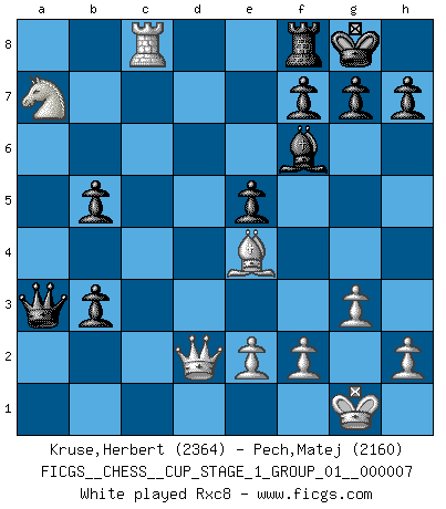 Last move : 1/2-1/2 2025 November 27 5:58:13 [Event "FICGS__CHESS__CUP_STAGE_1_GROUP_01__000007"] [Site "FICGS"] [Date "2025.05.16"] [Round "1"] [White "Kruse,Herbert"] [Black "Pech,Matej"] [Result "1/2-1/2"] [WhiteElo "2364"] [BlackElo "2160"] 1.g3 d5 2.Nf3 c5 3.Bg2 Nc6 4.d4 e6 5.O-O Nf6 6.c4 dxc4 7.Qa4 Bd7 8.Qxc4 b5 9.Qd3 c4 10.Qc2 Rc8 11.a4 a6 12.axb5 axb5 13.Bg5 Be7 14.Nc3 Qb6 15.Ne5 Nxd4 16.Qd2 Nb3 17.Qf4 Nxa1 18.Rd1 Rd8 19.Ne4 Bc8 20.Rxa1 Rd4 21.Bxf6 Rxe4 22.Bxe4 Bxf6 23.Nc6 e5 24.Qd2 Qc5 25.b4 cxb3 26.Rc1 Qa3 27.Na7 O-O 28.Rxc8 Qa1+ 29.Qc1 b2 30.Qb1 Rxc8 31.Nxc8 Qa6 32.Bxh7+ Kh8 33.Be4 Qxc8 34.Qxb2 Qc4 35.Bd3 Qd5 36.Qb1 g6 37.Bxb5 Kg7 38.h4 Qb7 39.Qd3 Be7 40.Ba4 Qb6 41.Bc2 Bc5 42.e3 Qf6 43.Qe4 Be7 44.h5 gxh5 45.Qh7+ Kf8 46.Qxh5 Bb4 47.Kf1 Ba5 48.Qg4 Qa6+ 49.Kg1 Qf6 50.Qc8+ Kg7 51.Qg4+ Kf8 52.Bh7 Ke7 53.Qa4 Bd8 54.Qg4 Bb6 55.Qb4+ Qd6 56.Qh4+ Qf6 57.Qb4+ Qd6 58.Qh4+ Qf6 59.Qb4+ 1/2-1/2 Follow this game move after move (download)Methodical thinking is of more use in Chess than inspiration. (C. J. S. Purdy) Schach ist Kampf, hauptsächlich jedoch gegen die eigenen Fehler. (Savielly Grigorievitsch Tartakower) Los Peones son el alma de una partida de Ajedrez. (Francois Andre Danican Philidor) Les Echecs sont et restent toujours un combat, un combat intégral comme la boxe, la lutte ou un autre sport, et où il doit y avoir un vainqueur et un vaincu. (Joseph Emil Diemer) Success without honor is an unseasoned dish; it will satisfy your hunger, but it won't taste good. (Joe Paterno)