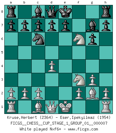 Last move : 1-0 2025 September 16 13:38:32 [Event "FICGS__CHESS__CUP_STAGE_1_GROUP_01__000007"] [Site "FICGS"] [Date "2025.05.16"] [Round "1"] [White "Kruse,Herbert"] [Black "Eser,Ipekyilmaz"] [Result "1-0"] [WhiteElo "2364"] [BlackElo "1954"] 1.g3 f6 2.d4 f5 3.Bg2 g6 4.Nc3 Bg7 5.e4 fxe4 6.Nxe4 Nc6 7.Nf3 Nf6 8.Nxf6+ exf6 9.d5 Ne5 10.d6 a6 11.Nxe5 fxe5 12.h4 cxd6 13.Be3 a5 14.a4 Ra6 15.Qd3 Qf6 16.O-O-O h6 17.Bd5 Kd8 18.Qb5 g5 19.f3 Kc7 20.Rd3 Kd8 21.Bb6+ Ke7 22.Kb1 Re8 23.Bxa5 Rc6 24.hxg5 hxg5 25.Bb6 Kf8 26.a5 Qg6 27.g4 Re6 28.Qb3 Qf6 29.R3d1 Qe7 30.Rh5 Rh6 31.Rxh6 Bxh6 32.Qd3 Kg7 33.Rh1 Qf8 34.Qd2 Rxb6 35.axb6 Kf6 36.Qd3 Kg7 37.Qc4 Kg6 38.Qe4+ Kg7 39.Bxb7 Qd8 40.Bxc8 Qxb6 41.Bxd7 Qb8 42.Be6 Qa7 43.Bb3 Kf8 44.Qf5+ Ke8 45.Ba4+ 1-0 Follow this game move after move (download)On the chessboard, lies and hypocrisy do not survive long. (Emanuel Lasker) Du kannst im Schach nur gut werden, wenn du das Spiel liebst. (Robert James Fischer) Observen a Garry Kasparov. Después de una derrota, invariablemente el gana la próxima partida. Prácticamente hace pedazos a su siguiente oponente. Eso es algo que tenemos que aprender a lograr. (Maurice Ashley) À la honte des hommes, on sait que les lois du jeu sont les seules qui soient partout justes, claires, inviolables et exécutées. Pourquoi l'Indien qui a donné les règles du jeu d'échecs est-il obéi de bon gré dans toute la terre, et que les décrétales des papes, par exemple, sont aujourd'hui un objet d'horreur et de mépris ? C'est que l'inventeur des échecs combina tout avec justesse pour la satisfaction des joueurs, et que les papes, dans leurs décrétales, n'eurent en vue que leur seul avantage. L'Indien voulut exercer également l'esprit des hommes et leur donner du plaisir; les papes ont voulu abrutir l'esprit des hommes. Voltaire (Dictionnaire philosophique / Garnier 1967) A married woman is like a fish riding a bicycle. (Rodolfo d'Ettorre)