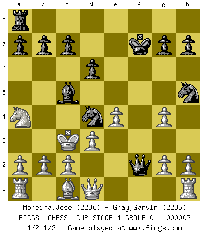 Last move : 1/2-1/2 2025 June 5 19:20:29 [Event "FICGS__CHESS__CUP_STAGE_1_GROUP_01__000007"] [Site "FICGS"] [Date "2025.05.16"] [Round "1"] [White "Moreira,Jose"] [Black "Gray,Garvin"] [Result "1/2-1/2"] [WhiteElo "2286"] [BlackElo "2285"] 1.e4 e5 2.Nf3 Nf6 3.Nc3 Nc6 4.Bb5 Nd4 5.Bc4 Bc5 6.d3 O-O 7.Nxe5 d6 8.Nxf7 Rxf7 9.Bxf7+ Kxf7 10.Na4 Bg4 11.f3 Nh5 12.fxg4 Qh4+ 13.Kd2 Qf2+ 14.Kc3 Nb5+ 15.Kb3 Nd4+ 16.Kc3 Nb5+ 17.Kb3 Nd4+ 18.Kc3 1/2-1/2 Follow this game move after move (download)The way he plays Chess demonstrates a man's whole nature. (Stanley Ellin) Konzentriere dich auf materielle Gewinne. Nimm, was dir dein Gegner gibt, ausser es gibt einen guten Grund der dagegenspricht. (Robert James Fischer) En posiciones complicadas, Bobby Fischer pocas veces tuvo que temer de cualquiera. (Paul Keres) Toutes choses étant égales, c'est la conviction qui gagne. Alliée à une volonté de vaincre, elle sert de détonateur, suscite des idées, disperse les doutes et aide à penser clairement. (Robert Fischer) May the force be with you. (Han Solo in Star Wars ep.4)