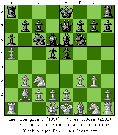 Last move : 0-1 2025 September 27 14:7:8 [Event "FICGS__CHESS__CUP_STAGE_1_GROUP_01__000007"] [Site "FICGS"] [Date "2025.05.16"] [Round "1"] [White "Eser,Ipekyilmaz"] [Black "Moreira,Jose"] [Result "0-1"] [WhiteElo "1954"] [BlackElo "2286"] 1.a3 d5 2.a4 e5 3.a5 Nf6 4.b3 Bd6 5.Bb2 a6 6.g3 Nc6 7.f3 Qe7 8.Nc3 Be6 9.Bh3 O-O-O 10.Ra4 Kb8 11.Qa1 h5 12.Kd1 g5 13.Bxe6 Qxe6 14.Kc1 g4 15.Nd1 d4 16.Nf2 Nb4 17.Ba3 c5 18.Kb2 e4 19.Qc1 e3 20.Nd3 Nfd5 21.h3 f5 22.hxg4 hxg4 23.Rxh8 Rxh8 24.Bxb4 cxb4 25.f4 Rh2 26.Ra1 Qc8 27.Qd1 Qc7 28.Qc1 Rg2 29.Qe1 exd2 30.Qxd2 Rxg3 31.Qc1 Nxf4 32.Rb1 Qxa5 33.Ra1 Qc7 34.Rb1 Ka7 35.Qd2 Qc3+ 36.Qxc3 dxc3+ 37.Ka1 Nxd3 38.exd3 Rg2 39.Rf1 Rxc2 40.d4 f4 41.Kb1 Rb2+ 42.Ka1 Rxb3 43.Ne2 g3 44.Ng1 Ra3+ 45.Kb1 b3 46.Rc1 b2 47.Rxc3 Rxc3 48.Kxb2 Ra3 49.Ne2 g2 50.Ng1 f3 51.Nh3 f2 52.Nxf2 g1Q 53.Nd3 Qxd4+ 54.Kb1 Qxd3+ 55.Kb2 Be5+ 56.Kc1 Ra1+ 0-1 Follow this game move after move (download)By the beauty of his games, the clarity of his play, and the brilliance of his ideas, Fischer made himself an artist of the same stature as Brahms, Rembrandt, and Shakespeare. (David Levy) Ein Remis kann durch Wiederholung von drei Zügen oder durch einen schlechte Zug erreicht werden. (Savielly Grigorievitsch Tartakower) El estómago es una parte esencial del maestro de Ajedrez. (Bent Larsen) A ce moment-là, je menaçais de comprendre la position ! (Clément L'Heureux) It's not the size of the dog in the fight, it's the size of the fight in the dog. (Mark Twain)