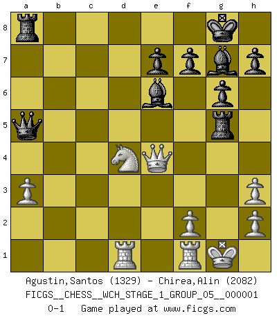 Last move : 0-1 2006 July 24 15:22:21 [Event "FICGS__CHESS__WCH_STAGE_1_GROUP_05__000001"] [Site "FICGS"] [Date "2006.07.01"] [Round "1"] [White "Agustin,Santos"] [Black "Chirea,Alin"] [Result "0-1"] [WhiteElo "1329"] [BlackElo "2082"] 1.d4 Nf6 2.c4 c6 3.Nc3 d5 4.Bf4 dxc4 5.e4 b5 6.a3 g6 7.Nf3 Bg7 8.Be2 O-O 9.O-O Nbd7 10.b3 cxb3 11.Qxb3 Nb6 12.Rad1 Be6 13.d5 cxd5 14.exd5 Nfxd5 15.Nxd5 Nxd5 16.Qxb5 a6 17.Qb7 Nxf4 18.Bxa6 Qa5 19.Bb5 Rfb8 20.Qe4 Nh3+ 21.gxh3 Rxb5 22.Nd4 Rg5+ 0-1 Queen's pawn game Kingside Castling by player Black (move 8) Kingside Castling by player White (move 9) Player Black won this chess game. Follow this game move after move (download)Botvinnik tried to take the mystery out of Chess, always relating it to situations in ordinary life. He used to call Chess a typical inexact problem similar to those which people are always having to solve in everyday life. (Garry Kasparov) Schach ist ein Kampf gegen den Fehler. (Johannes Herrman Zukertort) Un juego de Ajedrez es un dialogo, una conversación entre un jugador y su oponente. Cada movimiento del oponente puede contener amenazas o tropiezos, pero un jugador no se puede defender de las amenazas o tomar ventaja de los tropiezos si es que no se pregunta a sí mismo: ¿Que es lo que mi oponente va a hacer después de cada movida?. (Bruce A. Moon) Les réformistes prétendent que les progrès de la théorie conduiront à la disparition des échecs, et qu'il faut, pour leur rendre vie, en remanier les règles. En réalité, qu'exprime cette affirmation? Le mépris de l'intuition, de l'imagination et de tous les autres éléments qui font des échecs un art. (Alexander Alekhine) Luck is what you have left over after you give 100 percent. (Langston Coleman)