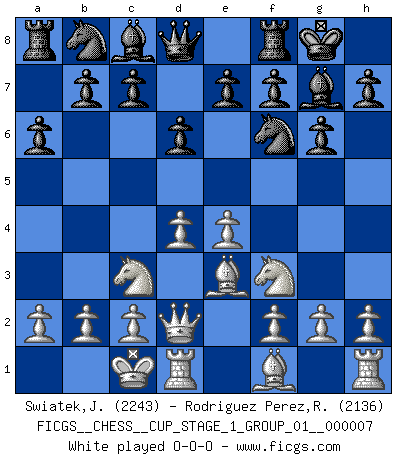 Last move : 1/2-1/2 2025 August 4 17:39:37 [Event "FICGS__CHESS__CUP_STAGE_1_GROUP_01__000007"] [Site "FICGS"] [Date "2025.05.16"] [Round "1"] [White "Swiatek,Janusz"] [Black "Rodriguez Perez,Rene"] [Result "1/2-1/2"] [WhiteElo "2243"] [BlackElo "2136"] 1.e4 d6 2.d4 Nf6 3.Nc3 g6 4.Be3 Bg7 5.Qd2 a6 6.Nf3 O-O 7.O-O-O Nc6 8.Bh6 b5 9.h4 b4 10.Bxg7 Kxg7 11.Nd5 Nxe4 12.Qe3 Nf6 13.Nxf6 exf6 14.h5 g5 15.h6+ Kh8 16.d5 Ne5 17.Bd3 a5 18.Nd4 Re8 19.Rde1 Bd7 20.Bf5 Bxf5 21.Nxf5 Qd7 22.Ng7 Rg8 23.Qe4 Qg4 24.Nf5 1/2-1/2 Follow this game move after move (download)Kasparov : J'adoube , Ivanchuk : S'il vous plaît ! (Garry Kasparov & Vassily Ivanchuk, Linares 1997) Die Jungen erwarten, dass Opa einfach umfällt. Dann aber kann Opa fünf Stunden lang Schach spielen und die jungen Gegner an die Wand drücken. (Viktor Kortschnoi) En posiciones complicadas, Bobby Fischer pocas veces tuvo que temer de cualquiera. (Paul Keres) Le temps de noter son nom sur la feuille de partie, j'étais déjà en zeitnot ! D'un modeste amateur apparié lors de la première ronde d'un open contre le grand-maître Azmaïparashvili. They misunderestimated me. (George W. Bush, Bentonville nov. 6, 2000)