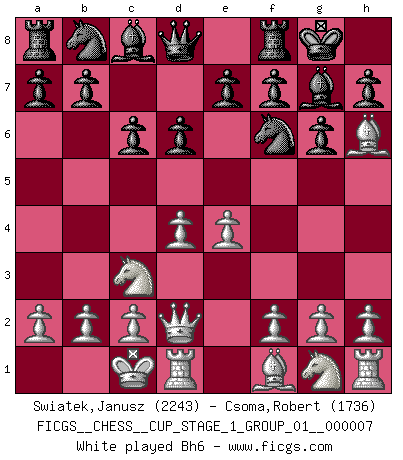 Last move : 1-0 2025 July 22 23:23:48 [Event "FICGS__CHESS__CUP_STAGE_1_GROUP_01__000007"] [Site "FICGS"] [Date "2025.05.16"] [Round "1"] [White "Swiatek,Janusz"] [Black "Csoma,Robert"] [Result "1-0"] [WhiteElo "2243"] [BlackElo "1736"] 1.e4 d6 2.d4 Nf6 3.Nc3 g6 4.Be3 Bg7 5.Qd2 O-O 6.O-O-O c6 7.Bh6 b5 8.f3 b4 9.Nce2 a5 10.h4 Na6 11.h5 a4 12.hxg6 fxg6 13.Bxg7 Kxg7 14.Qh6+ Kf7 15.e5 Ng8 16.Qxh7+ Ke8 17.Qxg6+ Kd7 18.exd6 exd6 19.Rh7+ Ne7 20.Re1 Qe8 21.Nf4 1-0 Follow this game move after move (download)Place the contents of the Chess box in a hat, shake them up vigorously, pour them on the board from a height of two feet, and you get the style of Steinitz. (H. E. Bird) Spiel ein langweiliges Spiel zu Ende und lustige Dinge können passieren. (Hans Ree) El Ajedrez tiene tanto misterio como las mujeres. (Purdy) J'ai toujours senti une vague pitié pour l'homme qui ne connaît rien aux échecs, tout comme j'en aurais pour un homme ignorant de l'amour. Les Echecs, comme la musique ou comme l'amour, ont le pouvoir de rendre heureux. (Siegbert Tarrasch) As a goal marker shodan is important. As a destination it is a poor place to stop. (Thomas Tamayo)