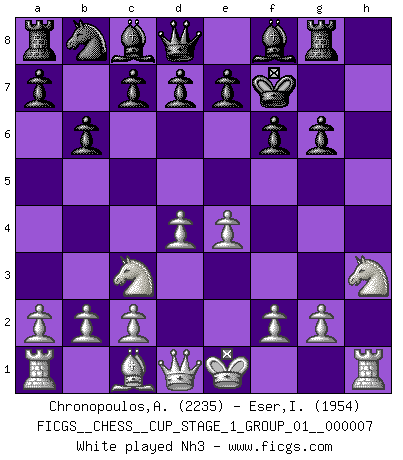Last move : 1-0 2025 November 13 17:35:21 [Event "FICGS__CHESS__CUP_STAGE_1_GROUP_01__000007"] [Site "FICGS"] [Date "2025.05.16"] [Round "1"] [White "Chronopoulos,Antonis"] [Black "Eser,Ipekyilmaz"] [Result "1-0"] [WhiteElo "2235"] [BlackElo "1954"] 1.d4 f6 2.e4 g6 3.h4 Nh6 4.Nc3 Nf7 5.Bc4 b6 6.Bxf7+ Kxf7 7.h5 Rg8 8.hxg6+ hxg6 9.Nh3 Bb7 10.Be3 b5 11.Qf3 b4 12.Nd5 Bxd5 13.exd5 Bg7 14.Nf4 Rh8 15.O-O-O a6 16.Rxh8 Qxh8 17.d6 Nc6 18.Qd5+ Ke8 19.Nxg6 e6 20.Qf3 Qg8 21.Ne7 Qh7 22.Nxc6 cxd6 23.Nxb4 d5 24.Nxd5 exd5 25.Bd2 Rc8 26.Re1+ Kf8 27.Bb4+ Kg8 28.Qxd5+ Kh8 29.Bc3 Rg8 30.g3 Bh6+ 31.Bd2 Bxd2+ 32.Kxd2 Rg5 33.Re8+ Rg8 34.Rxg8+ Qxg8 35.Qxg8+ Kxg8 36.Ke3 d6 37.Ke4 Kf8 38.Kd5 Ke7 39.a4 a5 40.f4 Kd7 41.f5 Ke7 42.c4 Kf7 43.Kxd6 Kg7 44.c5 Kh6 45.Kd5 Kh5 46.c6 Kg4 47.Ke4 Kh5 48.c7 Kh6 49.c8Q Kg7 50.Kd5 Kf7 51.Qc7+ Kf8 52.Ke6 Kg8 53.Kxf6 Kh8 54.Qg7+ 1-0 Follow this game move after move (download)You know you're going to lose. Even when I was ahead I knew I was going to lose. - On playing against Fischer. (Andrew Soltis) Ich war zu klein für die Schach-Schülermannschaft! (Woody Allen) En la perfecta combinación de Ajedrez como en una historia corta de primera clase, toda la trama y contra trama deberá conducir hacia un final sorprendente, el interes no es mitigado hasta el último momento. (Yates and Winter) Vous savez, camarade Pachman, je n'éprouve pas de plaisir à être ministre, je jouerais plutôt aux échecs comme vous, ou alors ferais une révolution au Venezuela. (Che Guevara à Ludek Pachman, 'Checkmate in Prague', 1975) Men should grow up. - Yeah. And dogs should stop licking themselves. It's not gonna happen. (Gregory House to Dr. Cameron, House M.D.)